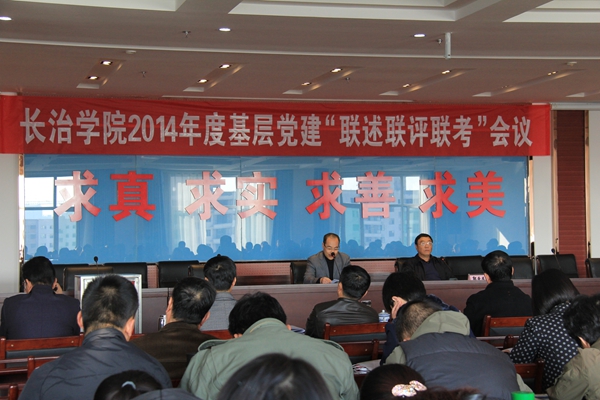 为巩固和扩大党的群众路线教育实践活动成果,推动学院“基层组织提升年”活动扎实有效开展,进一步健全和落实党建工作责任制,不断提高党组织书记党建工作第一责任人意识,提高学院党建工作科学化水平,根据山西省高校工委通知要求,我院于2014年11月13日下午两点半在1号教学楼10楼大会议室组织召开了联述联评联考”会议。参加会议的人员有学院领导、党群支部全体党员、行政支部部门正职、系部党总支书记、主任以及教师、学生代表等共124人。