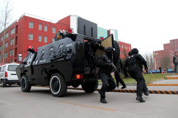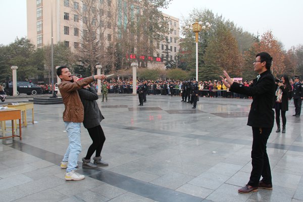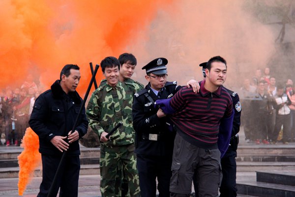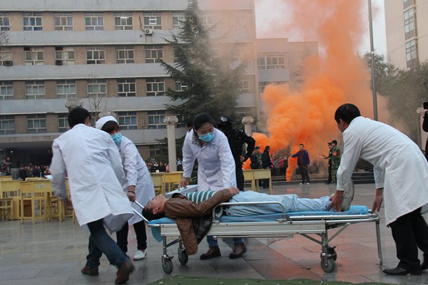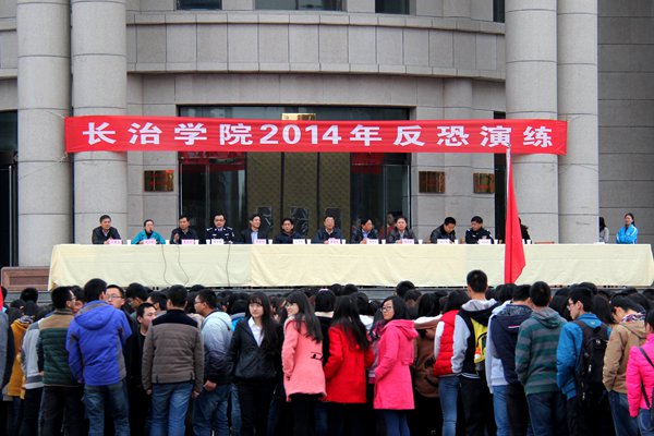 为了提高学生反恐意识,维护校园安全稳定,贯彻落实相关文件精神,确保我院教育教学和科研工作顺利进行。11月20日、21日下午,我院联合长治市公安局反恐支队、长治市太东派出所在南北校区分别举行反恐应急演练。参加此次演练的有长治市公安局反恐支队支队长秦翔南、团委书记兼闻发言人张云鹏、反恐支队政委王力宏、反恐大队大队长黄石鸣,太东派出所指导员武秋瑾,我院党委副书记郭爱民、纪委书记赵水琛、副院长武有祯、副院长李长江和相关部门领导以及学生代表共计3000余人。