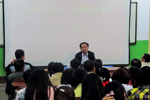 赵书记在紧紧围绕“三严三实”专题教育从严以律己的内涵、严以律己的重要性、怎样做到严以律己等三个方面对严以律己作了全面的阐释。他指出,严以律己就是强调要心存敬畏、手握戒尺,慎独慎微、修身养德,严格要求自己、坚定理想信念。他强调,做到严以律己要处理好主观和客观的关系,时刻坚持自重、自省、自警,随时检查自己的言行,切实做到知行合一、对党忠诚,带头弘扬社会主义道德风尚,始终做到清正廉洁。