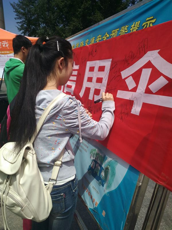 如今,在教学楼门口随处可见爱心伞置放处,每把爱心伞都有专属编号,同学们在登记后即可使用,三天内将晾干的雨伞再做归还,以方便更多的同学。此项公益行动一经推行,便受到同学们的热烈响应,诚信签名活动的当天,同学们络绎不绝,纷纷在条幅上签下名字,承诺做诚信校园人,将爱心伞的公益精神传递下去。