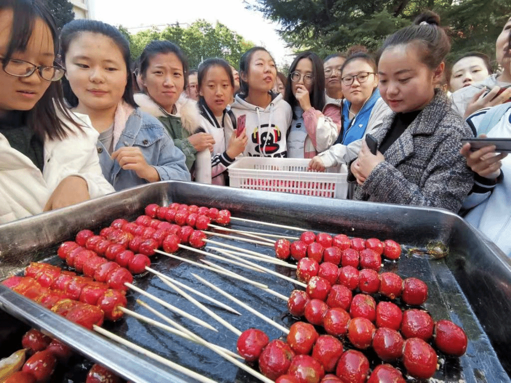 本届红果节主题是“送福团圆红火火,共享校园文明果”。物业阿姨们从浇灌呵护了一年的山楂树上,把熟透的果实采摘下来,交给食堂大师傅们精心制作成一串串晶莹剔透、团团圆圆的糖葫芦发给同学们吃,收获季节、共享硕果,酸酸甜甜、开心幸福……看吧,红果节同学们开心的笑脸,看吧,人头攒动,红红火火的场面,“嗨,来晚的同学你也分两颗……”一位同学伸出了只剩3颗的“串儿”,“好嘞!”停下匆忙的脚步,囫囵着放到嘴里,共同品味着酸甜。