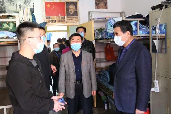 校领导实地察看了所有返校报到过程中的重点环节、风险点和防控点,检查返校学生报到和寝室的用电、用水、安全卫生等情况,并与已经登记入住的同学亲切交流。在健康信息登记区,郝勇东仔细询问报到学生:“你家是哪里的?”“你坐什么交通工具过来的?”“感觉怎么样?还适应吗?”“有事情可以咨询学生处和辅导员老师。”在学生宿舍,茹文明亲切叮嘱入住学生:“要去户外多走动,不要串宿舍”“要勤洗手,多通风,不要扎堆”“我们安排有心理辅导老师,有需要可以预约心理辅导咨询。”老师的声声叮咛和丝丝关怀,温暖着同学们的心窝,让他们在学校感受到了家的温暖和父母一般的爱。同学们纷纷表示,一定按照学校安排,遵守纪律,做好防护,在圆满完成学业的同时,和学校一起取得抗疫的最后胜利。在看望已返校学生的同时,郝勇东、茹文明等校领导特别深入到即将安排封闭教师入住的宿舍进行检查,对于发现的问题要求有关单位立行立改,要及时收集入住教师反映的问题,切实为同志们提供一个良好的生活、学习环境,确保开学复课各项工作顺利进行。