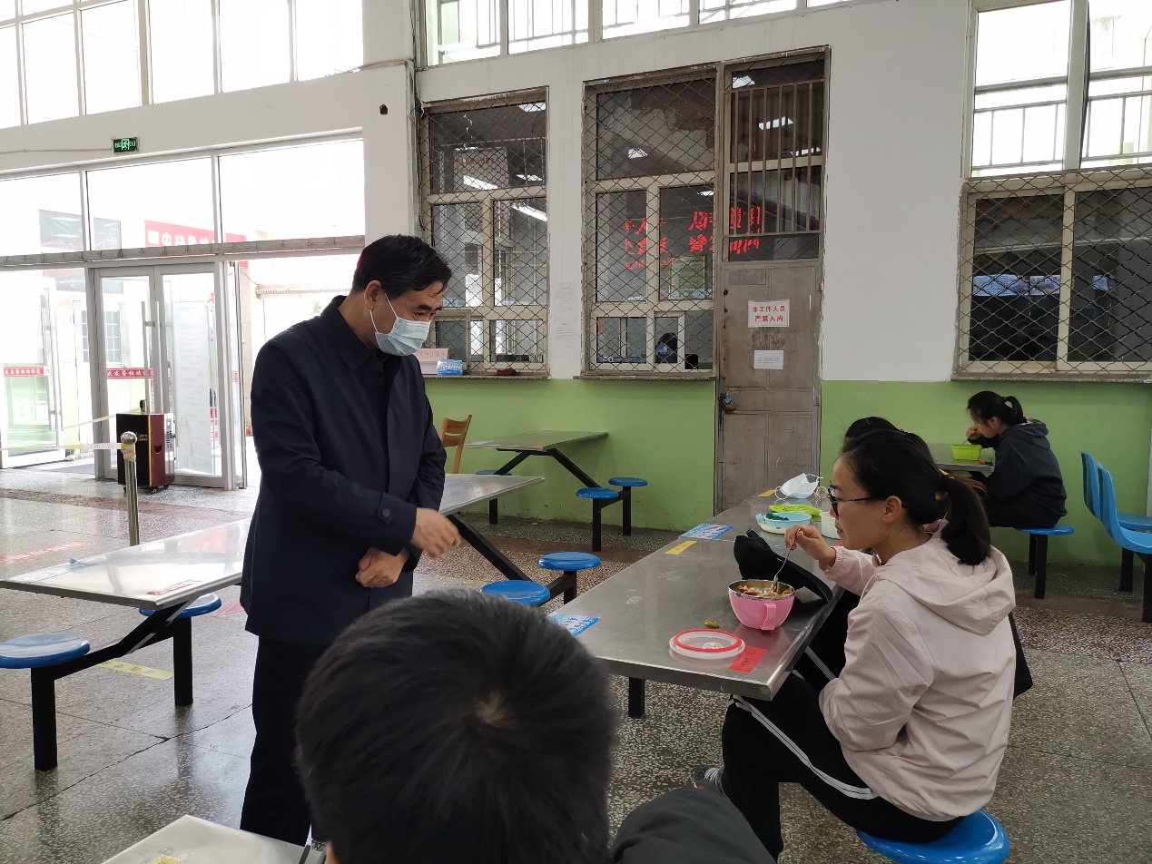 4月30日中午,在“五一”国际劳动节前夕,郝勇东来到位于隔离区的实验室、学生公寓、学生食堂、自习室和辅导员值班室,慰问假期值班工作人员并看望住校学生。在学生食堂,郝勇东详细询问开饭时间以及学生就餐情况、防疫措施和卫生状况。他向食堂全体工作人员的辛勤工作表示慰问和感谢,叮嘱大家一定要严格执行疫情期间工作流程,嘱咐大家时刻绷紧安全这根弦,为在校学生提供安全健康的饮食保障和就餐环境。在教室和实验室,郝勇东与在场老师一一握手,了解了大家的值班情况、住校学生情况以及医疗服务等事关住校毕业生现实需求的各项细致情况,并嘱咐大家在“五一”期间继续坚守岗位,为住校学生做好服务。郝勇东亲切看望了正在宿舍、自习室中认真学习的毕业年级学生,他十分关心学生们的毕业论文答辩时间和准备情况,并询问了解了部分考研学生的复试安排和准备工作,并预祝大家节日愉快。