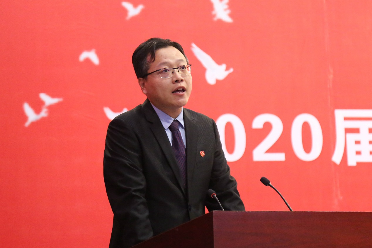 党委副书记马健宏宣读《关于表彰2020届优秀毕业生的决定》,授予李娜等340名同学“优秀毕业生”荣誉称号。党委委员、副院长赵巨涛介绍2020届毕业生情况和学位授予情况。教师代表、电子信息与物理系张凡博士,毕业生代表、法律与经济学系法学1601班杨婧分别发言。