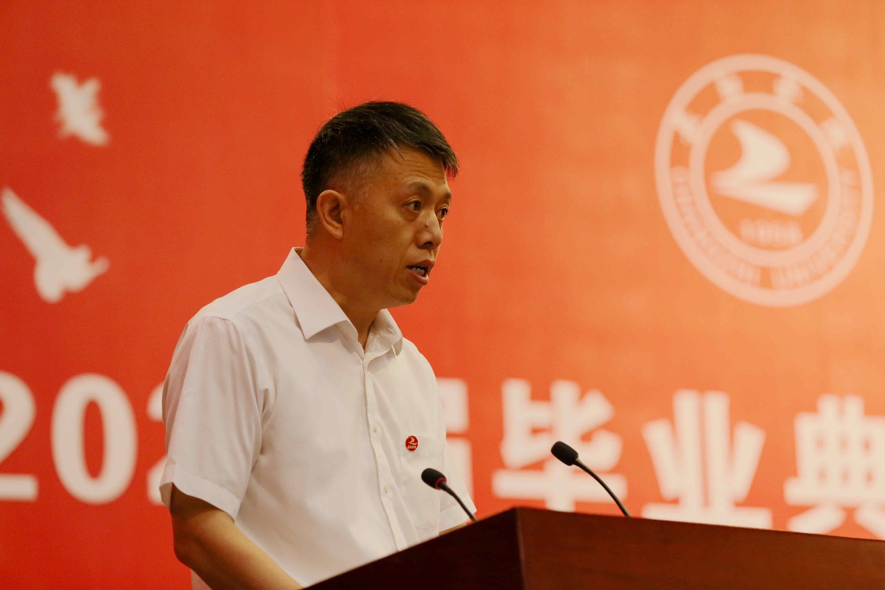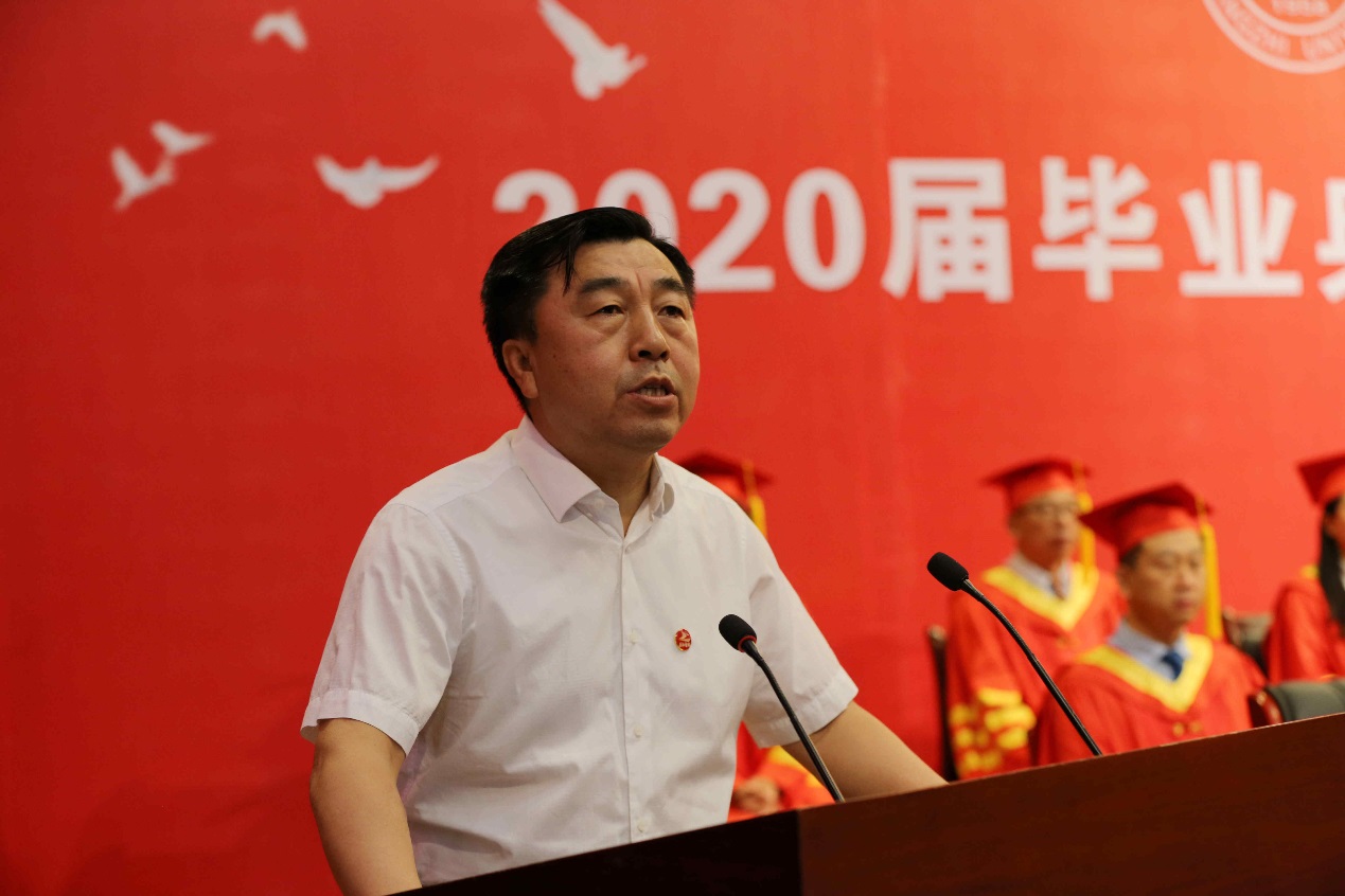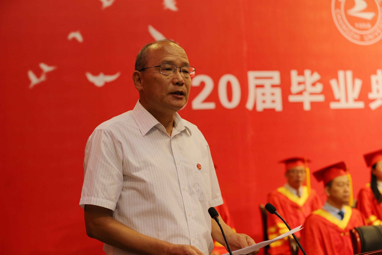 党委副书记、院长茹文明在毕业典礼上致辞。他首先代表学校领导和万余名师生员向2020届全体毕业生致以最热烈的祝贺和最美好的祝愿。他指出,2020年遭遇新冠疫情,同学们没有慌张,没有被疫情所吓倒,而是积极调整心态,很快适应了新的学习模式;大家克服生活上的困难,服从学校关于疫情防控的各项管理措施;大家忙碌于各种线上招聘,紧抓每一次就业机会;大家主动成为志愿者,为学校和社区的疫情防控贡献爱心与力量。在这个过程中,beat365亚洲体育官方网站涌现出了一大批优秀的榜样,他们没有因为遭遇疫情而怨天尤人,反而将其作为人生的一种宝贵的财富和难忘的回忆同。同时,对毕业生提出几点希望与嘱托: