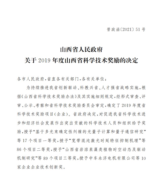 近日,山西省人民政府下发《关于2019年度山西省科学技术奖励的决定》(晋政函〔2021〕51号),根据《山西省科学技术奖励办法》及其实施细则规定,经形式审查、形式审查结果公示、学科(专业)组评审、评审委员会评审、评审委员会评审结果公示、考察和省科学技术奖励委员会审定,beat365李燕教授等人完成的《高活性层状吸附/光催化纳米复合材料的构筑及对水净化应用的基础研究》成果荣获2019年度山西省自然科学奖三等奖。