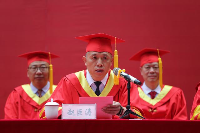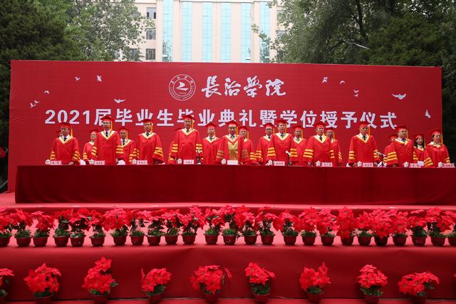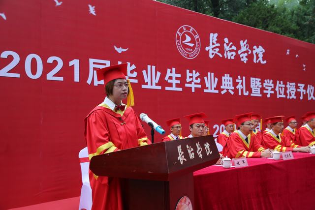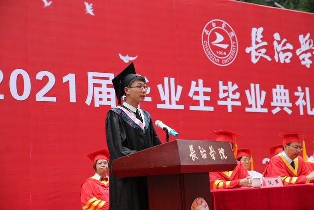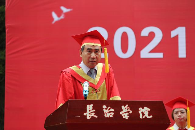 郝勇东以《不忘初心担使命 逐梦未来再出发》为题发表了热情洋溢的致辞。他首先代表学校党政领导和全体师生向2021届毕业生致以最美好的祝愿,寄语毕业生在人生新的征程上,努力做情系家国、心怀天下、视野开阔、自信从容的新时代青年。他对毕业生提出五点希望;一是立志报国,做时代使命的担当者。希望同学们能够树立远大的理想抱负,想国家之所想、急国家之所急、应国家之所需,始终与祖国同心同向同行,把小我融入兴国、强国的大我之中,以青春之我、奋斗之我在实现中华民族伟大复兴中国梦的实践中放飞青春梦想,书写人生华章。二是牢记太行精神,做红色基因的传承者。红色基因植根于革命先烈用鲜血染红的泥土中,传承于一代一代人不懈奋斗的事业中。长治是一块红色热土,这里孕育锻造了伟大的太行精神。学校在办学治校的过程中,始终把传承弘扬太行精神作为立德树人的重要内容,用太行精神培育学生成才、激励学生成长,希望同学们无论今后走到哪里、身居何处,都能永葆这份红色信仰,让红色基因代代相传,让革命薪火常燃不灭。三是崇德向善,做良好风尚的示范者。德是为人之本、立身之基,一个人只有打牢修身立德的根基,人生的道路才能越走越开阔,希望同学们涵养正气,恪守正道,弘扬新风尚,传递正能量,作新时代明大德、守公德、严私德的榜样和示范。四是逐梦前行,做脚踏实地的奋斗者。希望同学们把脚踏实地、努力奋斗作为一种精神追求和社会责任,任何时候都不驰于空想,不骛于虚声,做只争朝夕的行动者,做脚踏实地的实干家,躬身前行,久久为功,在不懈奋斗中成就自己的出彩人生。五是敢闯敢拼,做勇立潮头的创新者。希望同学们作为国之栋梁,能够自觉学习和弘扬科学家精神,立雄心壮志、攀科技高峰,以敢闯敢拼、敢为人先的精神,作新时代创新的生力军、排头兵,在建设科技强国的伟业中,贡献自己的青春力量。