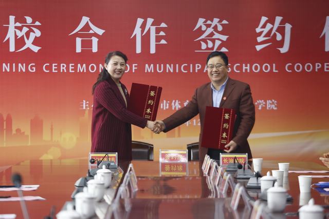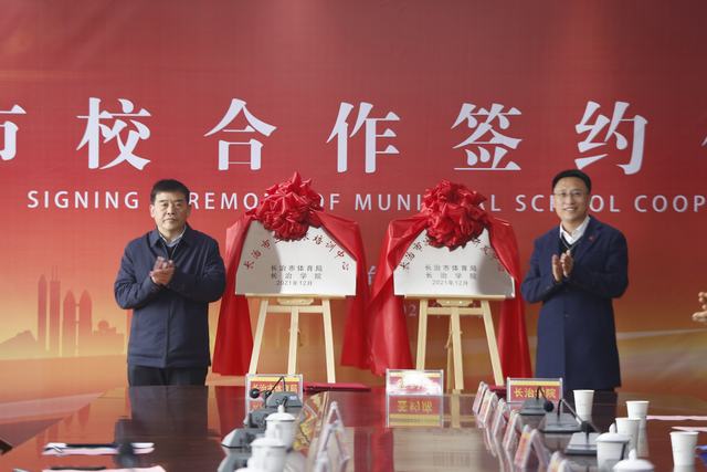 随后,双方就科技创新、人才培养、课题合作、志愿服务等内容进行了深度交流。曹景川校长与张庆宏局长共同为“长治市三大球项目培训基地”和“长治市冰雪运动研发中心”揭牌。李强副校长与谢慧兰副局长现场签订合作协议。整个会议在友好融洽的气氛中结束。会后,双方合影留念。