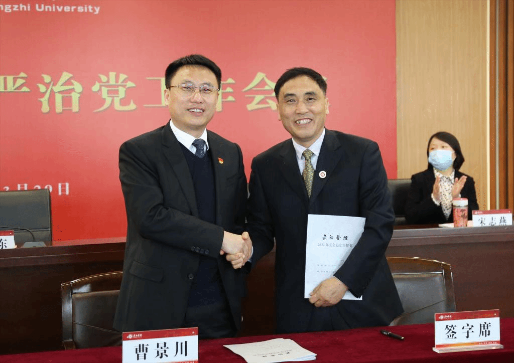 会上,郝勇东与党务部门负责人、二级党委书记代表签订《全面从严治党主体责任目标责任书》,与行政部门负责人、教学系部主任代表签订《全面从严治党“一岗双责”目标责任书》。郝勇东、曹景川与部门负责人、教学系部党政负责人代表签订《安全稳定责任书》。