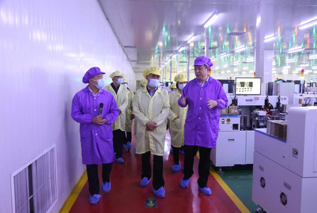 调研第二站来到山西高科华烨电子集团有限公司。公司现有1家CNAS国家光电实验室、2家国家高新技术企业、2家省级企业技术中心。郝勇东一行听取了崔程远总经理对集团发展情况的介绍,参观了华杰光电公司车间、华兴电子公司固晶站、焊线站、分光站以及华晨电子公司瑞昌源检测中心。