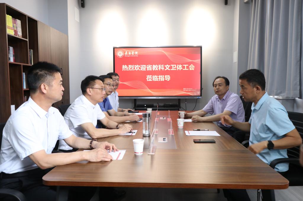 7月18日,省教科文卫体工会常务副主席尹玉平、副主席马仕仁一行来beat365调研指导工会工作。校长曹景川,党委副书记史晓东,党委委员、副校长铁军出席调研座谈会。校工会以及校长办公室、宣传部等部门负责人陪同调研。