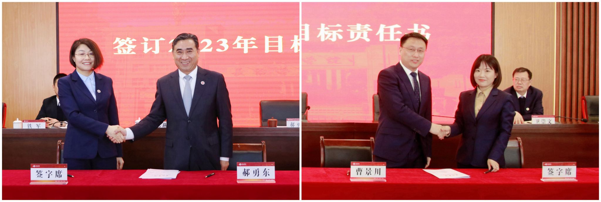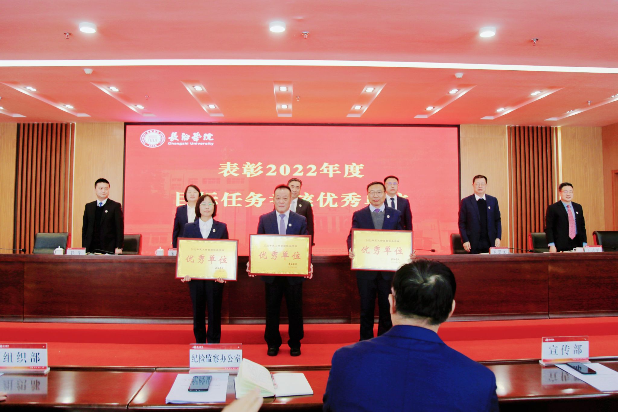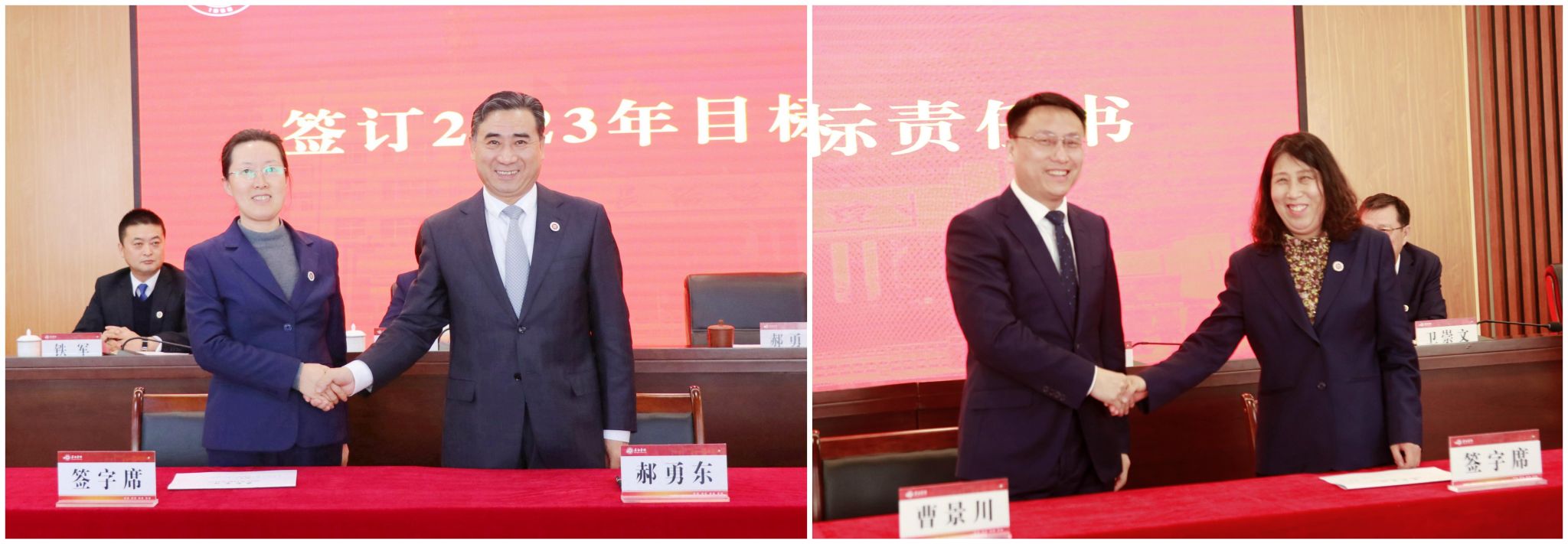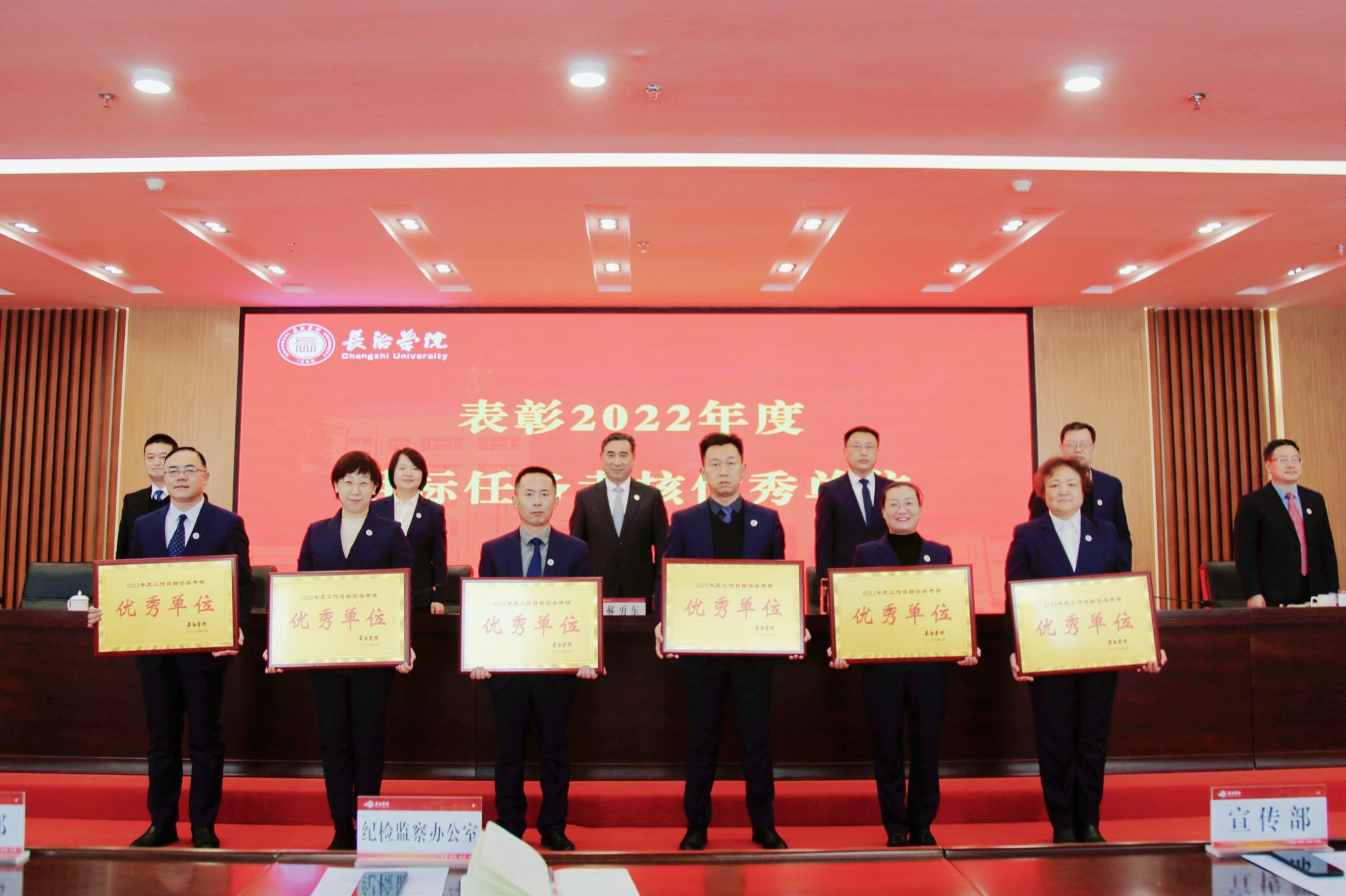 会上,校领导为上年度目标责任制考核优秀单位颁奖。优秀单位代表体育系主任李明、物理系主任刘建伟、教务部主任杨晓娟进行了交流发言。二级单位代表现场签订了2023年目标责任书。
