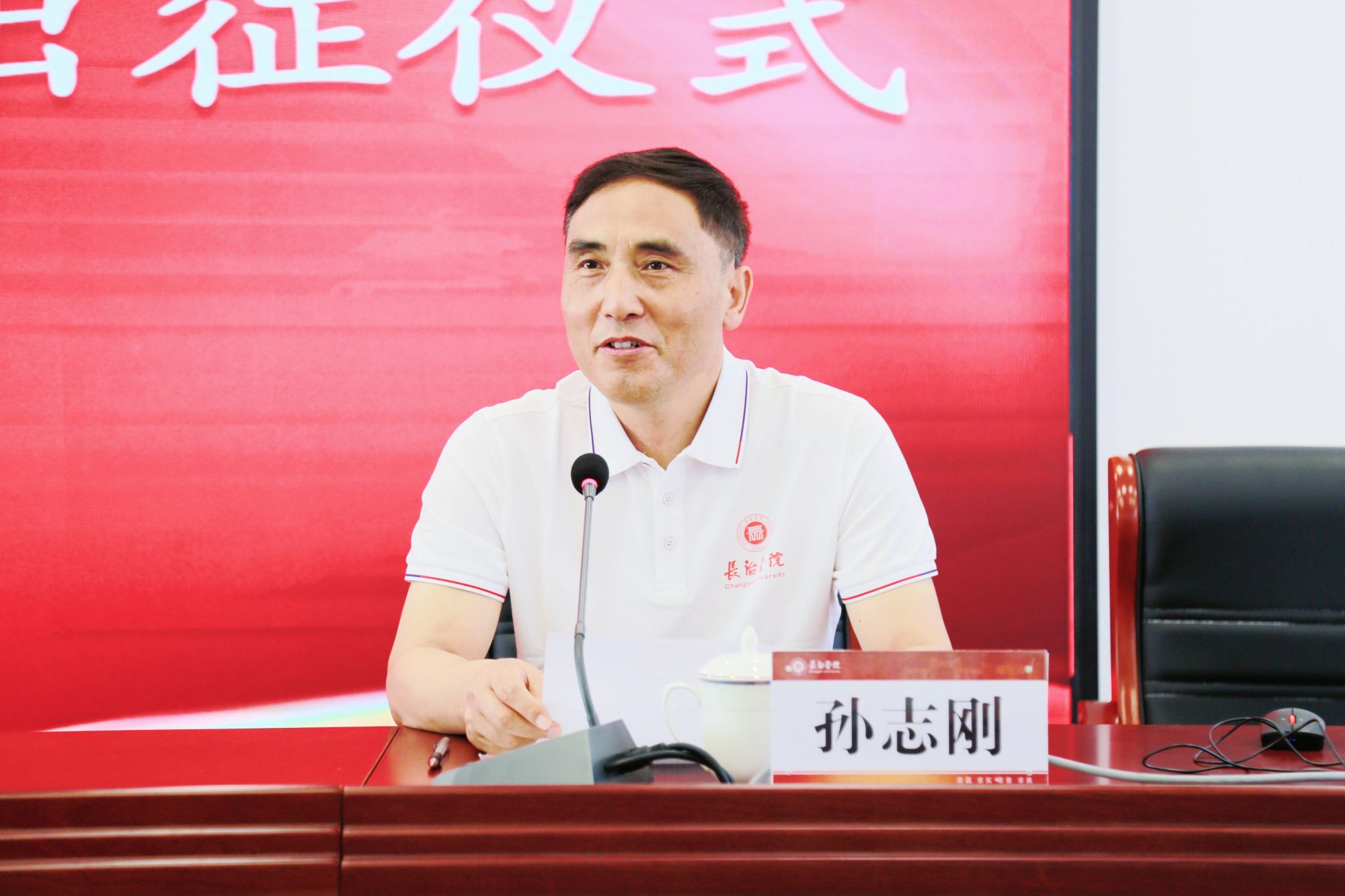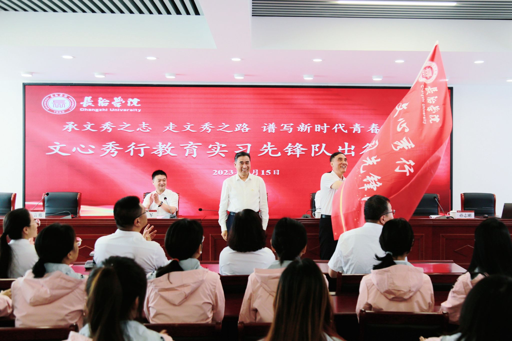 会上,郝勇东为先锋队授“beat365亚洲体育官方网站文心秀行教育实习先锋队”队旗,指导教师孙志刚代表先锋队郑重地接过队旗,接受了光荣任务和使命。