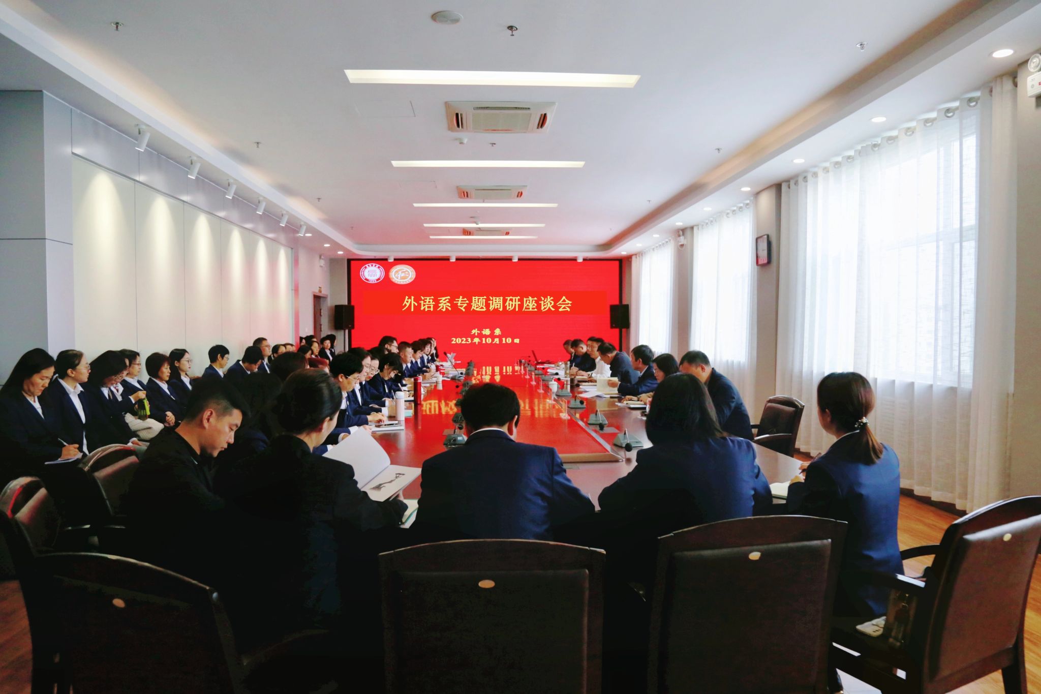 2023年10月10日,校长曹景川,副校长卫崇文、铁军、武月明到外语系调研指导工作。校长办公室、教务部、科研部、人力资源部负责人陪同调研。外语系班子成员及全体教职工参加了调研座谈会。会议由外语系主任郭佳主持。