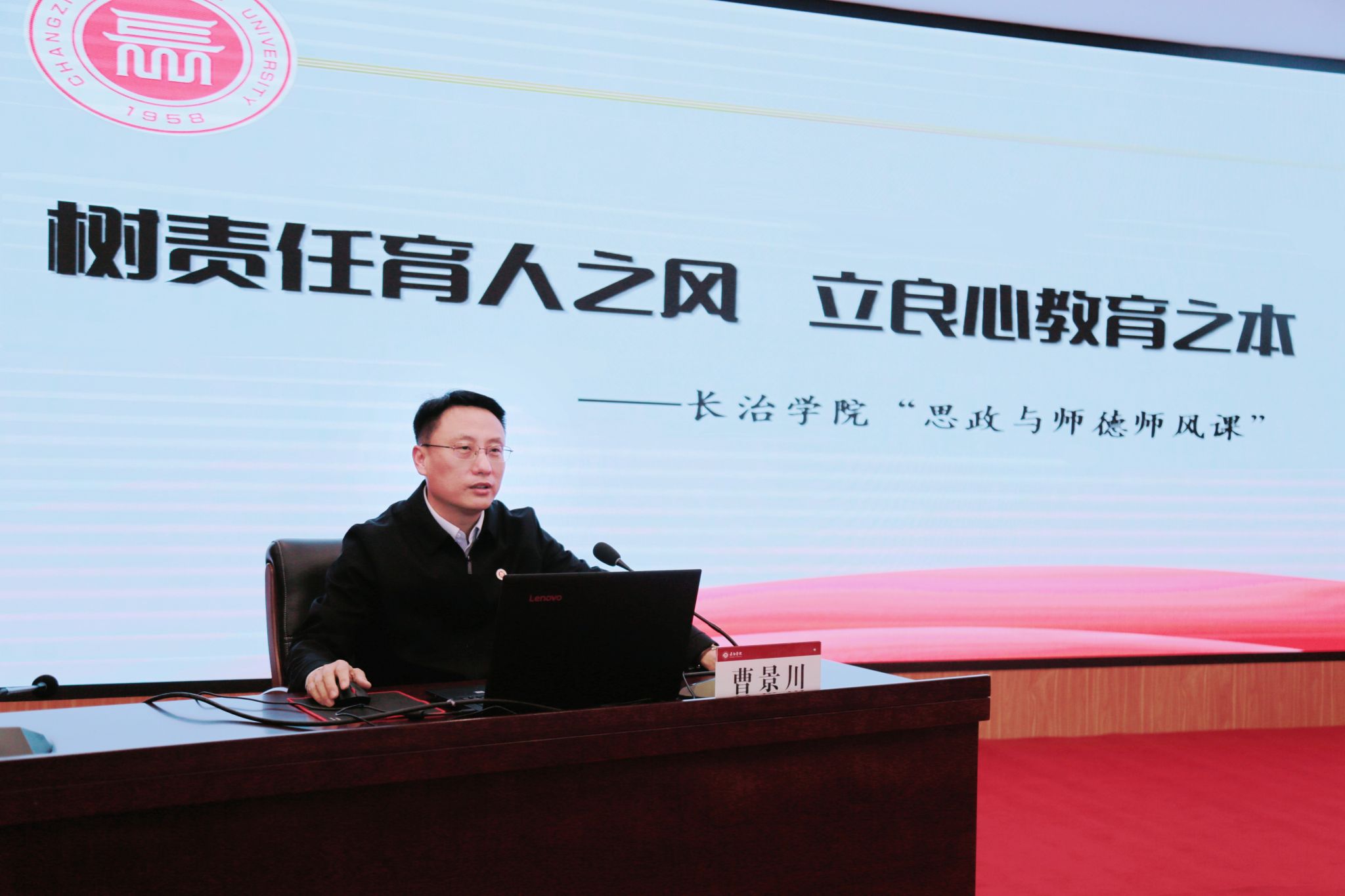 为深入学习贯彻习近平总书记关于师德师风第一标准的重要论述,落实省教育厅有关部署要求,12月13日,校党委副书记、校长曹景川以《树责任育人之风 立良心教育之本》为题在北校区1号会议室讲授一堂“思政与师德师风课”。党委副书记史晓东,党委委员、纪委书记、监察专员焦雨,党委委员、副校长卫崇文、铁军、王志军、武月明出席,各职能部门负责人,各系处级干部、党支部书记、教研室主任、实验室主任及教师代表参加。活动由卫崇文主持。