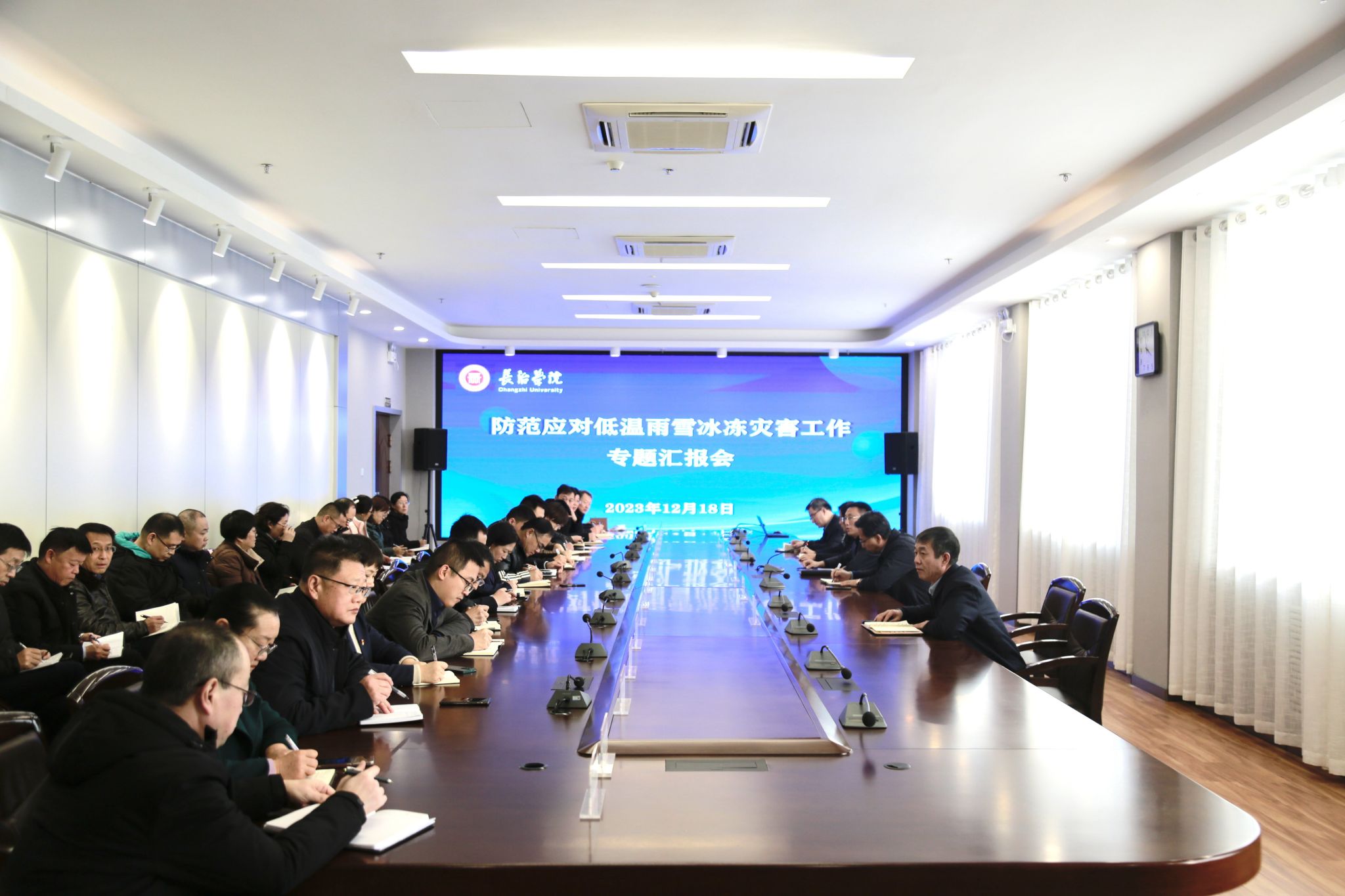 12月18日,beat365召开防范应对低温雨雪冰冻灾害工作专题汇报会。校领导、各职能部门和各系负责人参加会议。校长曹景川主持会议并讲话。