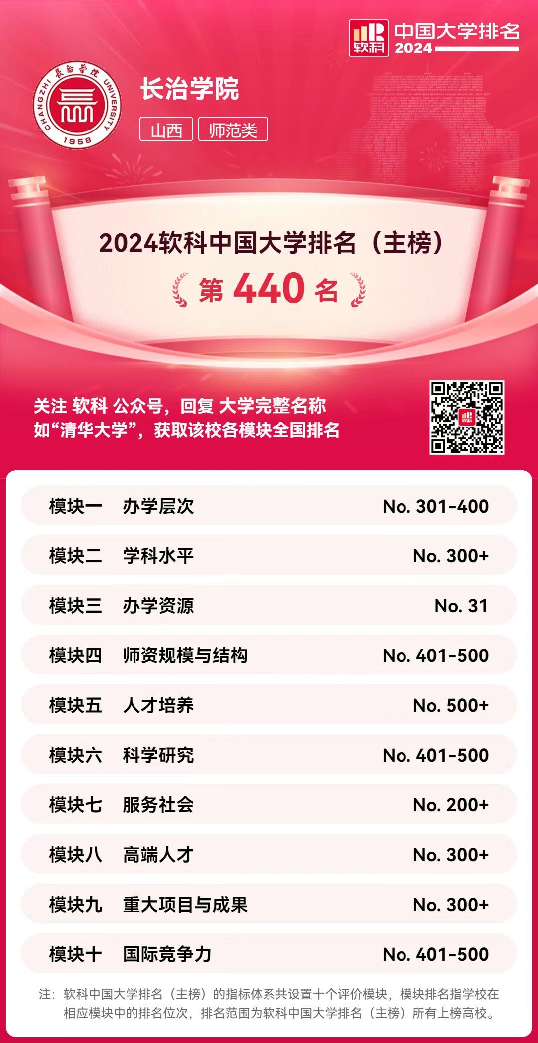 “软科中国大学排名”设置了办学层次、学科水平、办学资源、师资规模与结构、人才培养、科学研究、服务社会、高端人才、重大项目与成果、国际竞争力共10个评价模块,细分36个评价维度,内嵌100项评价指标,涉及373个评价变量,是对中国大学办学水平的立体化监测式评价。自2015年首次发布以来,以专业、客观、透明的优势赢得了高等教育领域内外的广泛关注和认可,已经成为具有重要社会影响力和权威参考价值的中国大学排名领先品牌。