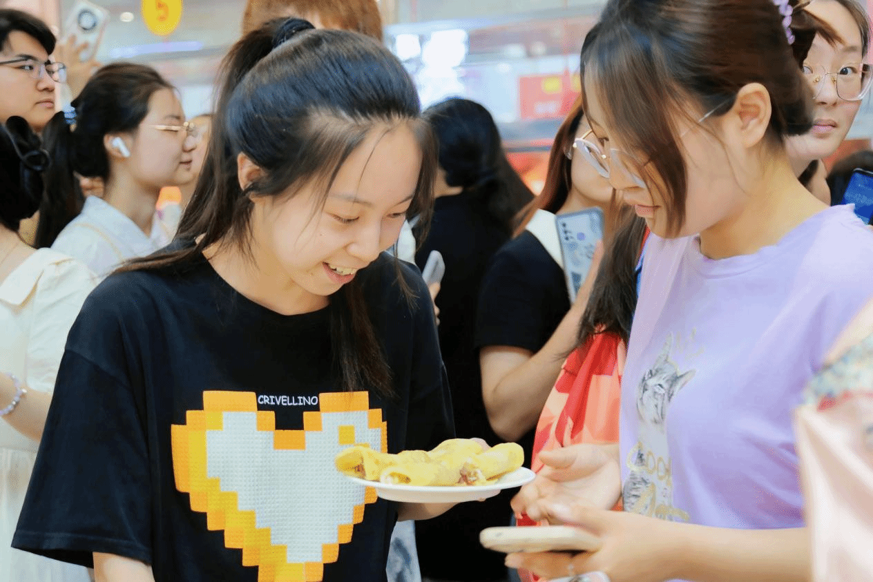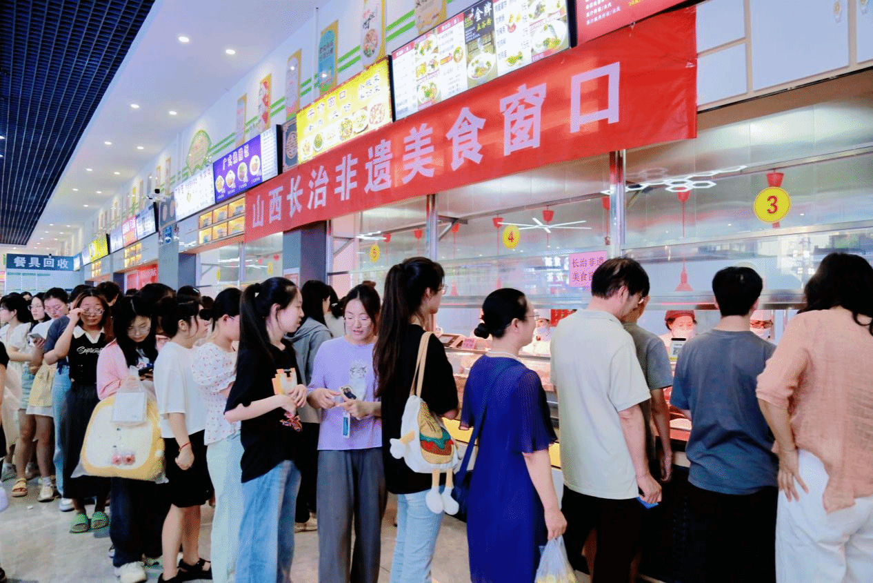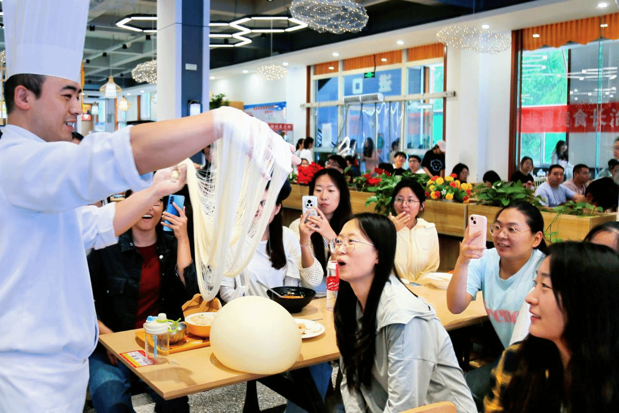 活动现场,各种美食、非遗展品琳琅满目,热闹异常。猪头肉、甩饼、炒饼、枣糕、羊汤、夹馅汤等各种美食散发着诱人香气。长治美食传承人在现场表演了龙须拉面、长寿一根面、吹气球、蒙眼剪面、头顶刀削面等高超技艺。师生们自发聚集在现场,不时传来赞叹和欢呼声,一阵阵热烈的掌声此起彼伏,整个场面充满了热情和活力。