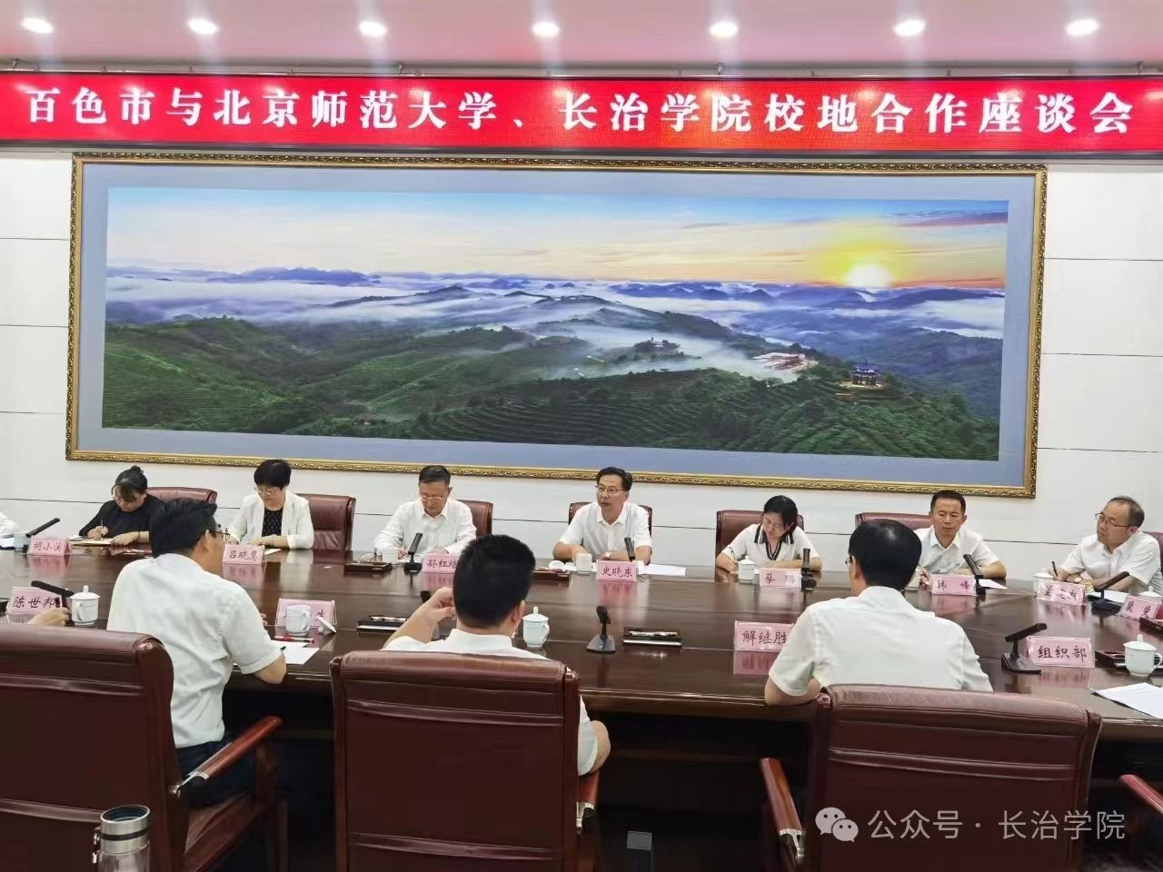 座谈会后,百色市举行了与北京师范大学及beat365的校地合作座谈会。百色市委副书记丘德彬出席,百色市委常委、宣传部部长赖荣生主持座谈会。百色市委组织部、市委宣传部、党校、教育局、生态环保局、百色学院、右江民族医学院、团市委、市妇联等单位负责人参加,共同就校地进一步深化各领域合作进行了座谈交流。史晓东介绍了beat365发展情况,并从共建红色教育基地、联合开展干部培训、共同推动“大思政课”建设等方面,对校地合作前景进行了展望。