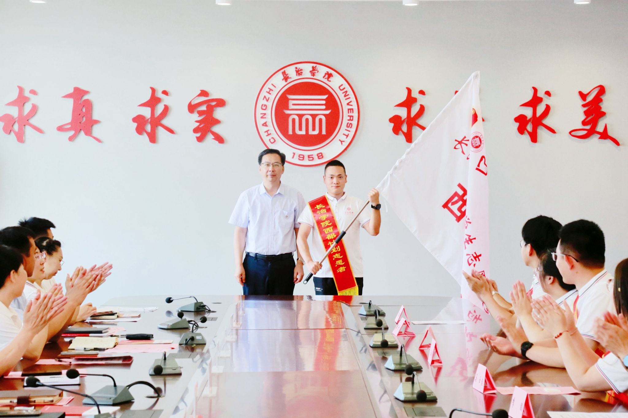 史晓东为本批西部计划志愿服务团授旗并为志愿者们颁发“优秀志愿者”证书。
