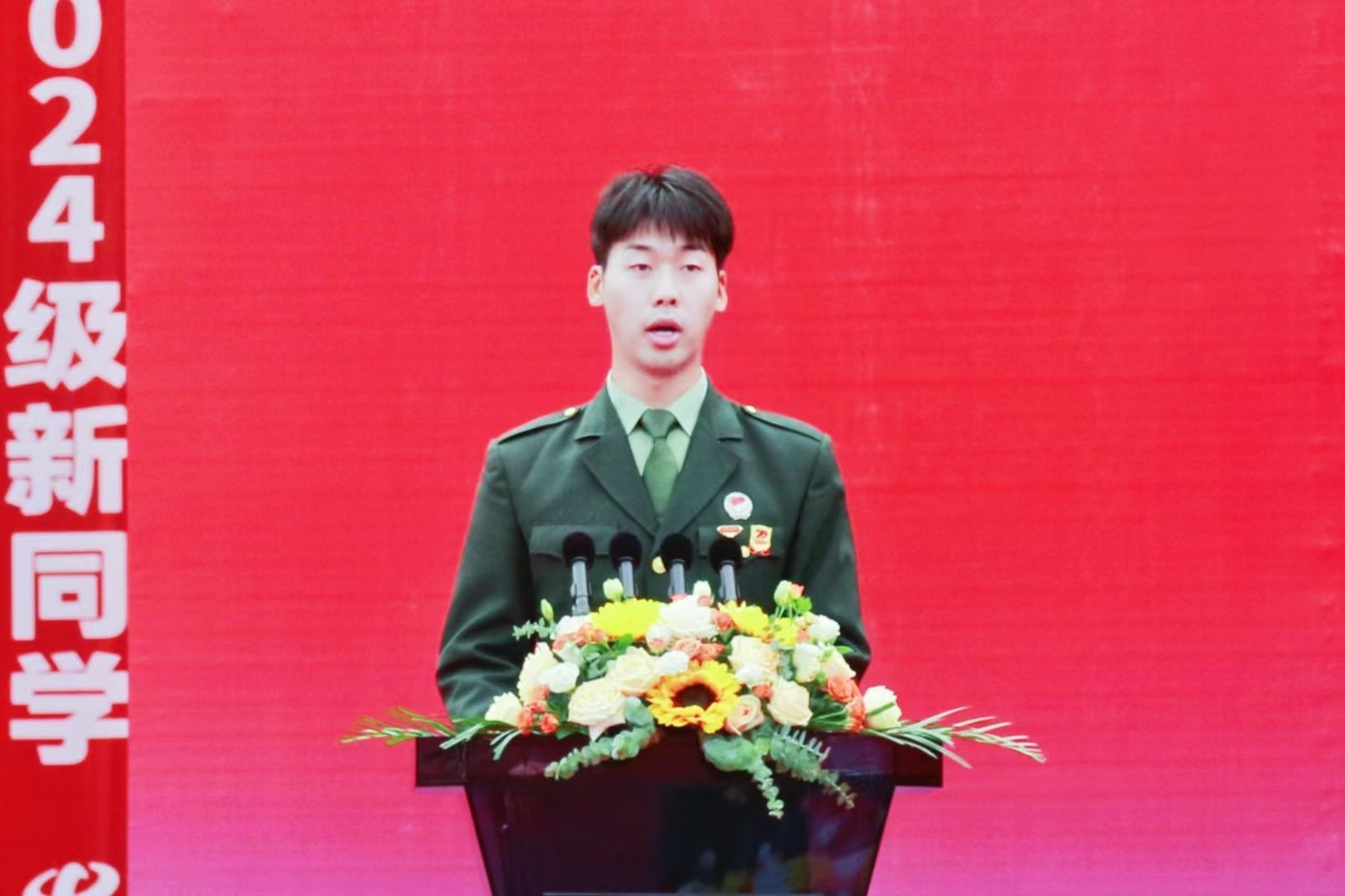 原中国人民解放军仪仗大队国旗护卫队队员、国家励志奖学金获得者、美术系视传2102班贾子龙同学代表高年级学生发言。他分享了参军入伍和参与“七一勋章”颁授仪式勤务的难忘经历,鼓励新生认真学习杰出校友黄文秀先进事迹,走好正步人生,在挑战中超越自我,谱写青春华章。
