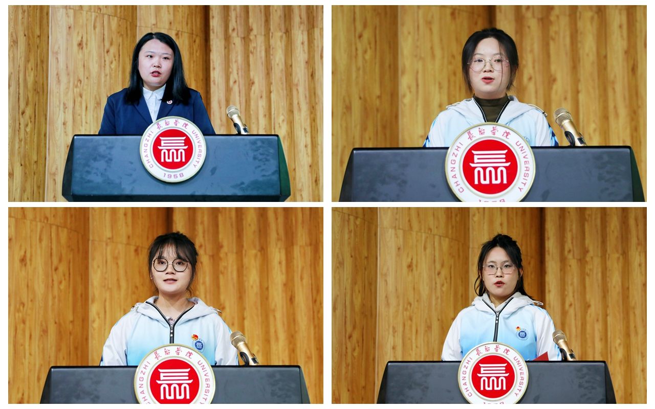 会上,生命科学系教师张国晨、中文系学生程菁菁、马克思主义学院学生申迅、外语系学生李诚毅作为受表彰代表进行了交流发言。