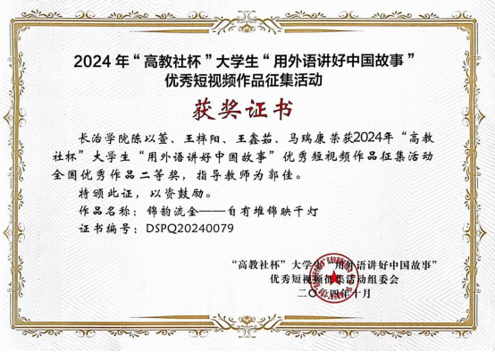近日,2024年“高教社杯”大学生“用外语讲好中国故事”优秀短视频作品征集活动圆满落幕,beat365外语系学生陈以萱、王梓阳、王鑫茹、马瑞康在外语系主任郭佳指导下,以获得山西省特等奖的作品《锦韵流金——自有堆锦映千灯》参加国赛,荣获国家级二等奖,是beat365参加该赛事以来所取得的最好成绩。