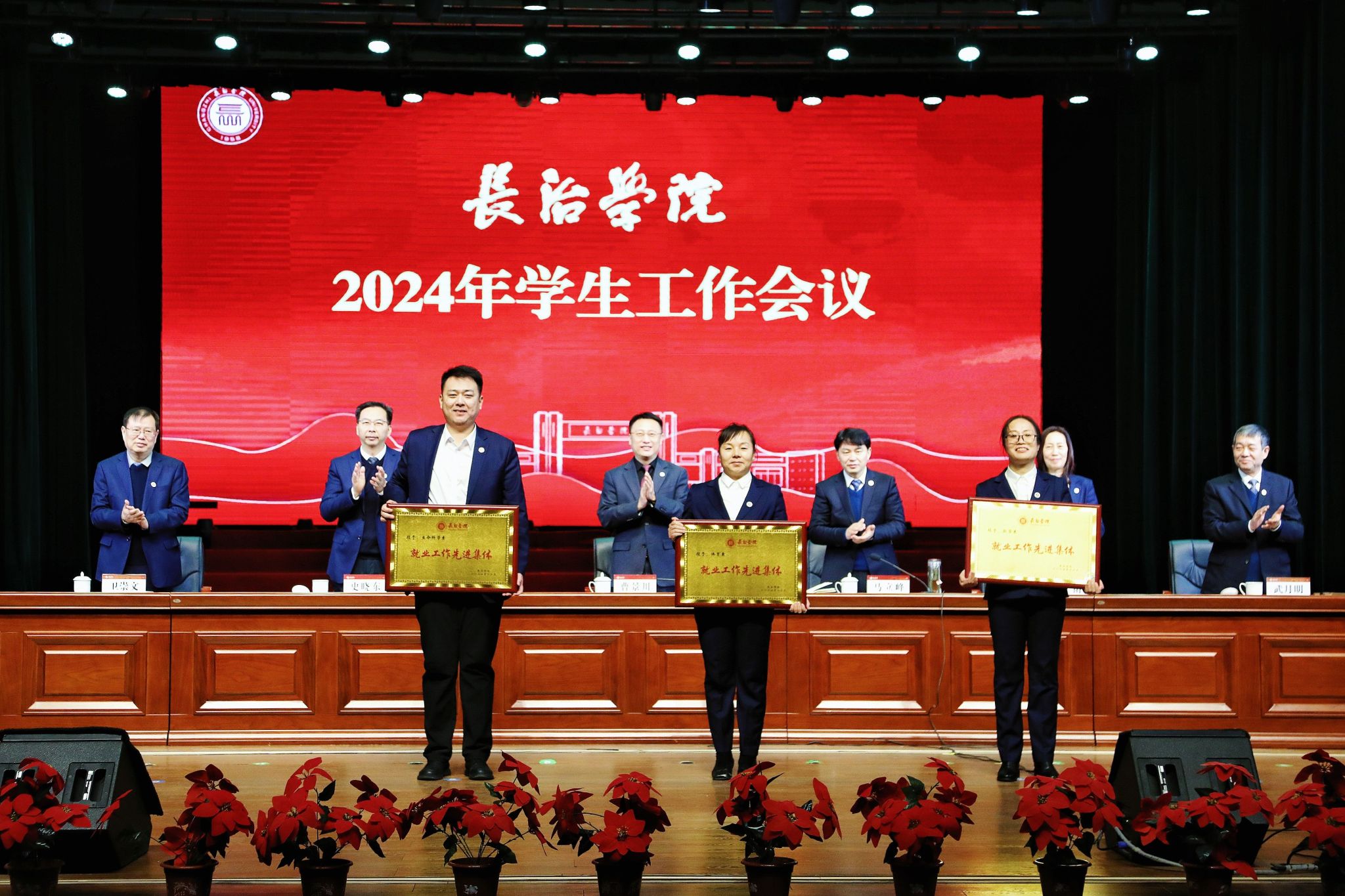 与会校领导为学生工作先进单位、就业工作先进单位、优秀辅导员、优秀学生工作者、优秀就业创业工作者、标兵班集体、先进班集体、优秀学生干部、优秀学生和国家奖学金、国家励志奖学金的获得者颁发了奖牌和荣誉证书。