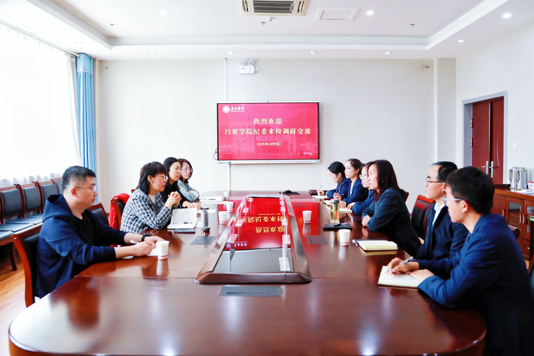 焦雨对吕梁学院纪委的到来表示热烈欢迎。双方分别介绍了各自纪检监察机构的组织架构、人员构成及工作开展情况。重点围绕深入贯彻中央八项规定精神学习教育、开展“纪检监察工作规范化法治化正规化建设年”行动、加快推进工作高质量发展等展开深入研讨。两校纪检监察干部就推进政治监督具体化精准化常态化、提升办案质效、校内巡察、清廉学校建设等方面交流了经验做法。