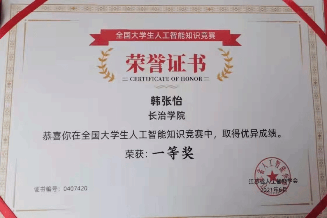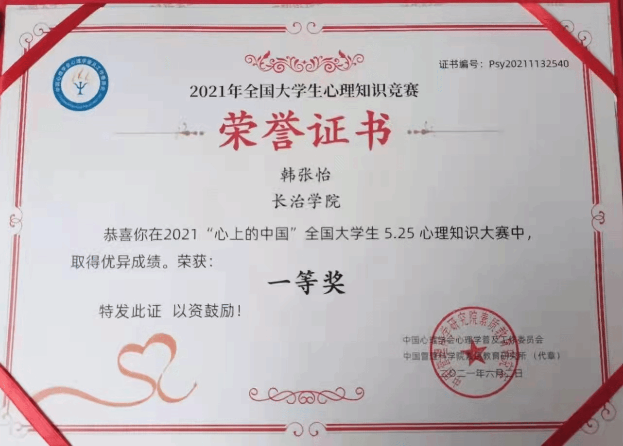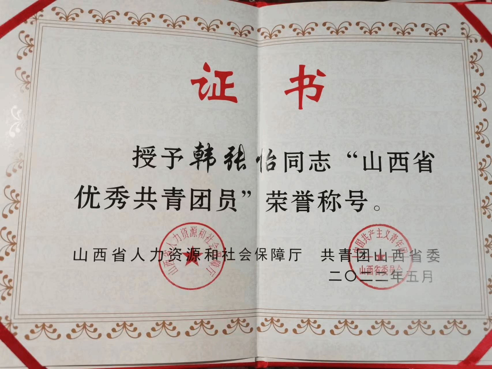 韩张怡同学自入学以来,认真学习专业知识,通过英语四级、教师资格证等考试;在各类比赛中屡获佳绩,获2021年“心上的中国”全国大学生5.25心理知识大赛一等奖、2021年第二届全国高校“一带一路”知识竞赛一等奖、2021年全国大学生人工智能知识竞赛一等奖、2021年高校毕业生就业协会大学生就业能力大赛一等奖、2022年“读者杯”全国大学生新春诗词大会一等奖等。2022年被授予“山西省优秀共青团员”荣誉称号。她积极参加校内外和共青团的各类活动,将党史、团史学习融入日常生活,在行动中践行社会主义核心价值观,弘扬中华民族传统美德,展现出共青团员的担当。