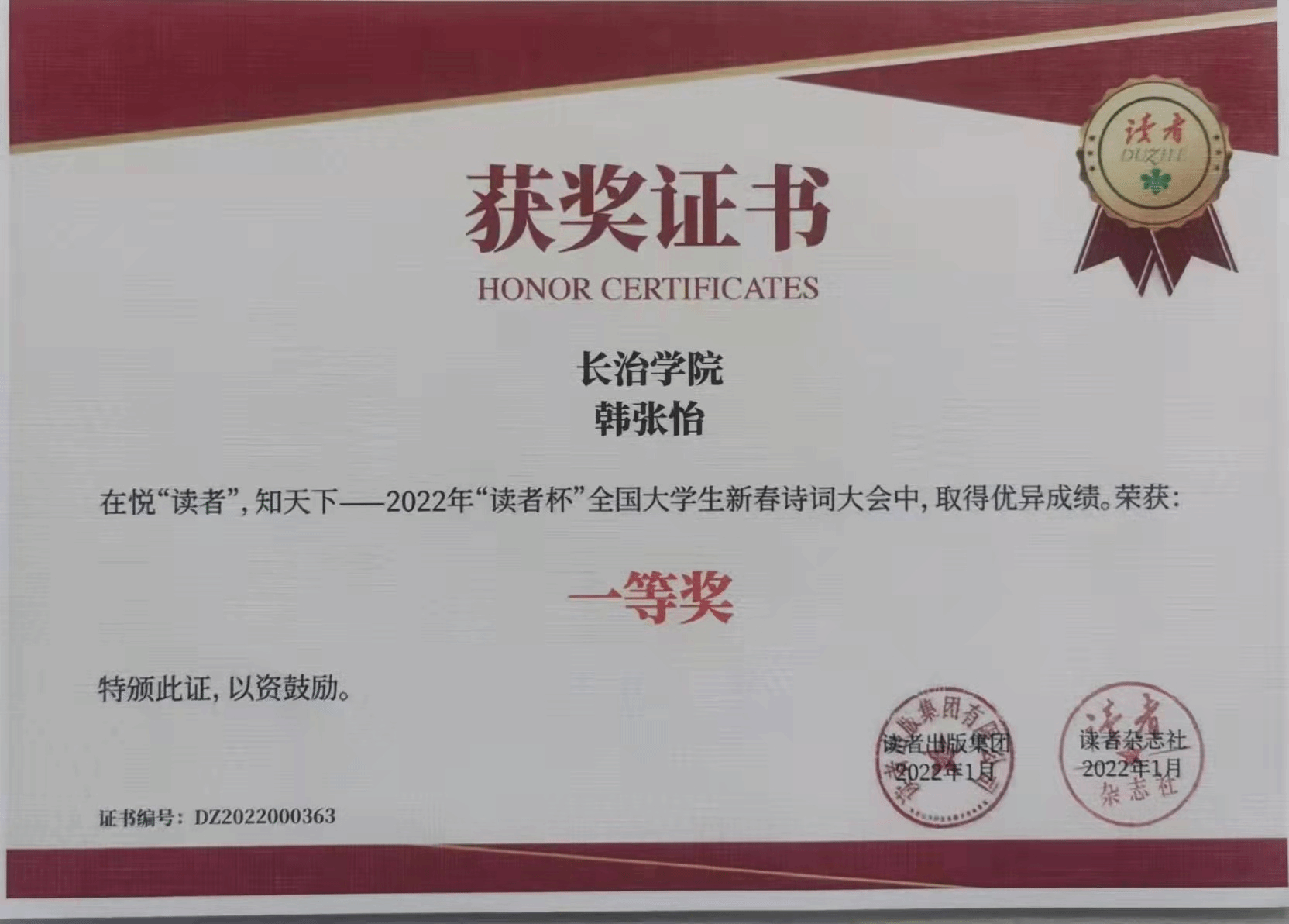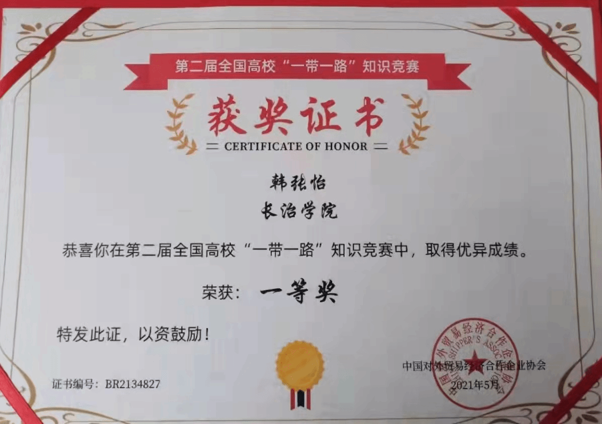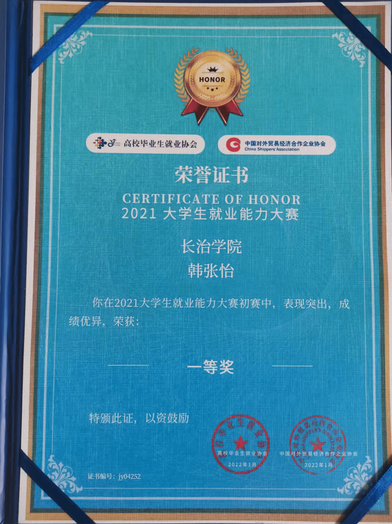 韩张怡同学自入学以来,认真学习专业知识,通过英语四级、教师资格证等考试;在各类比赛中屡获佳绩,获2021年“心上的中国”全国大学生5.25心理知识大赛一等奖、2021年第二届全国高校“一带一路”知识竞赛一等奖、2021年全国大学生人工智能知识竞赛一等奖、2021年高校毕业生就业协会大学生就业能力大赛一等奖、2022年“读者杯”全国大学生新春诗词大会一等奖等。2022年被授予“山西省优秀共青团员”荣誉称号。她积极参加校内外和共青团的各类活动,将党史、团史学习融入日常生活,在行动中践行社会主义核心价值观,弘扬中华民族传统美德,展现出共青团员的担当。