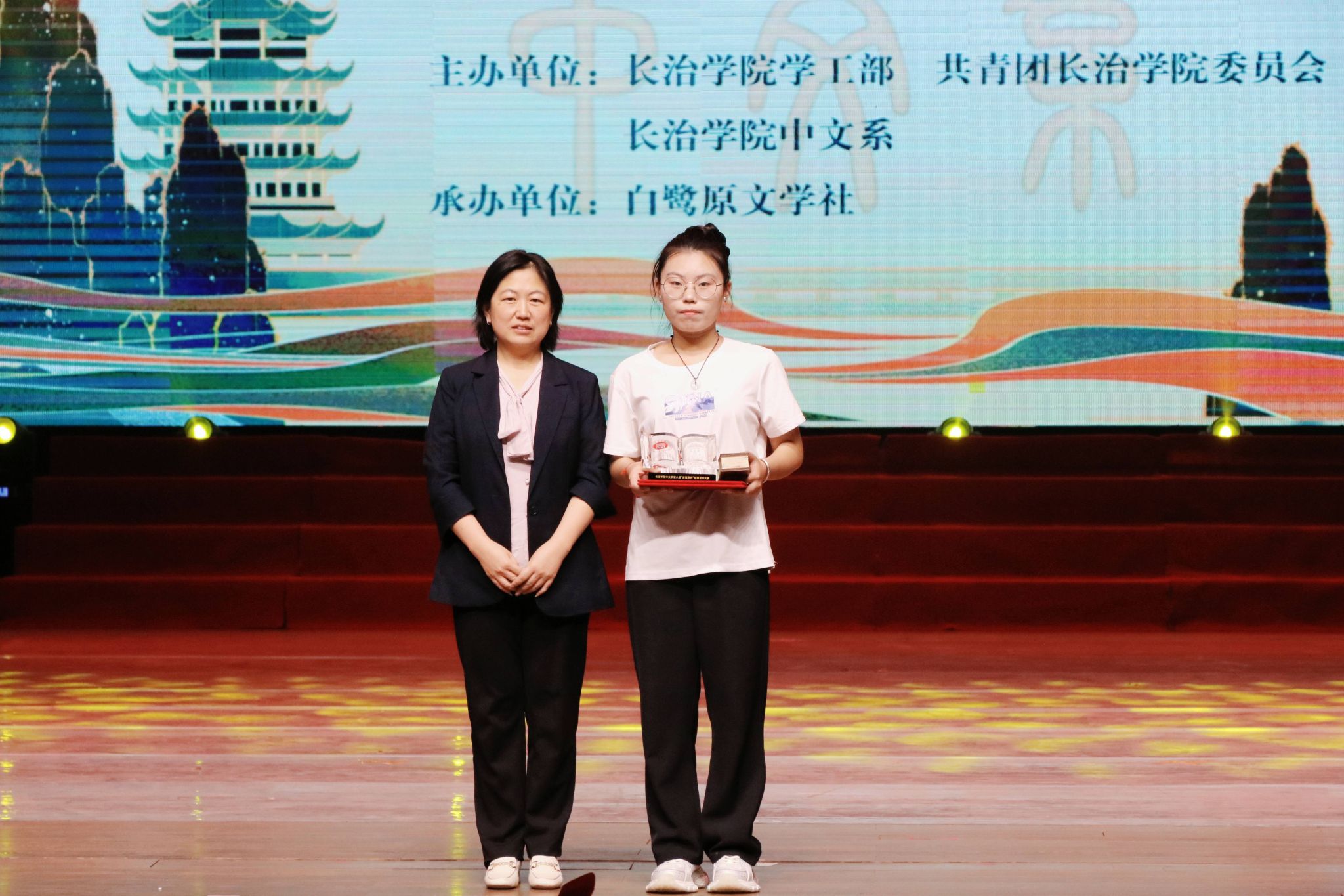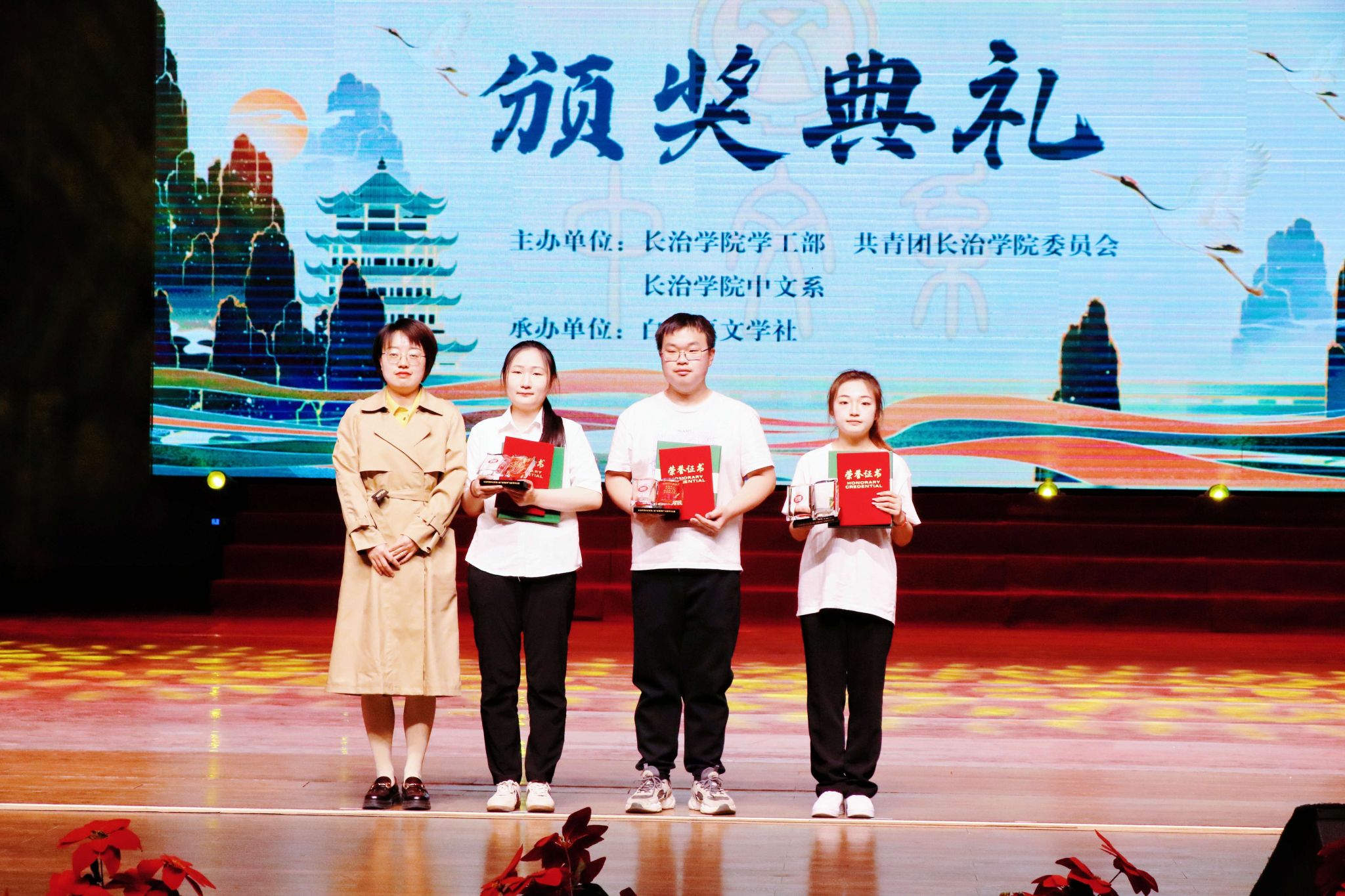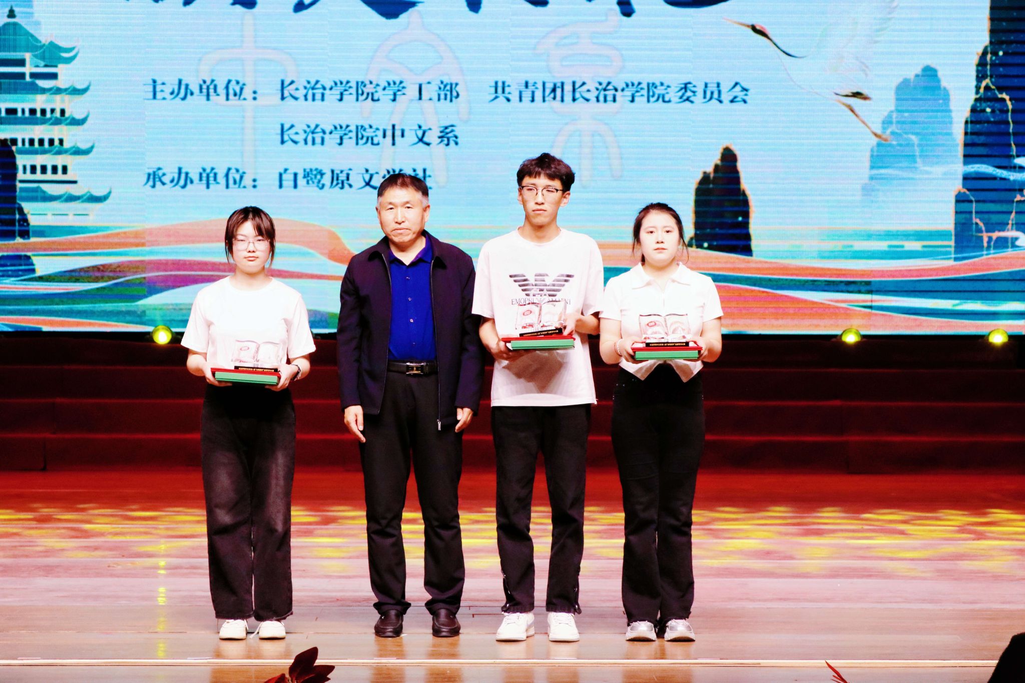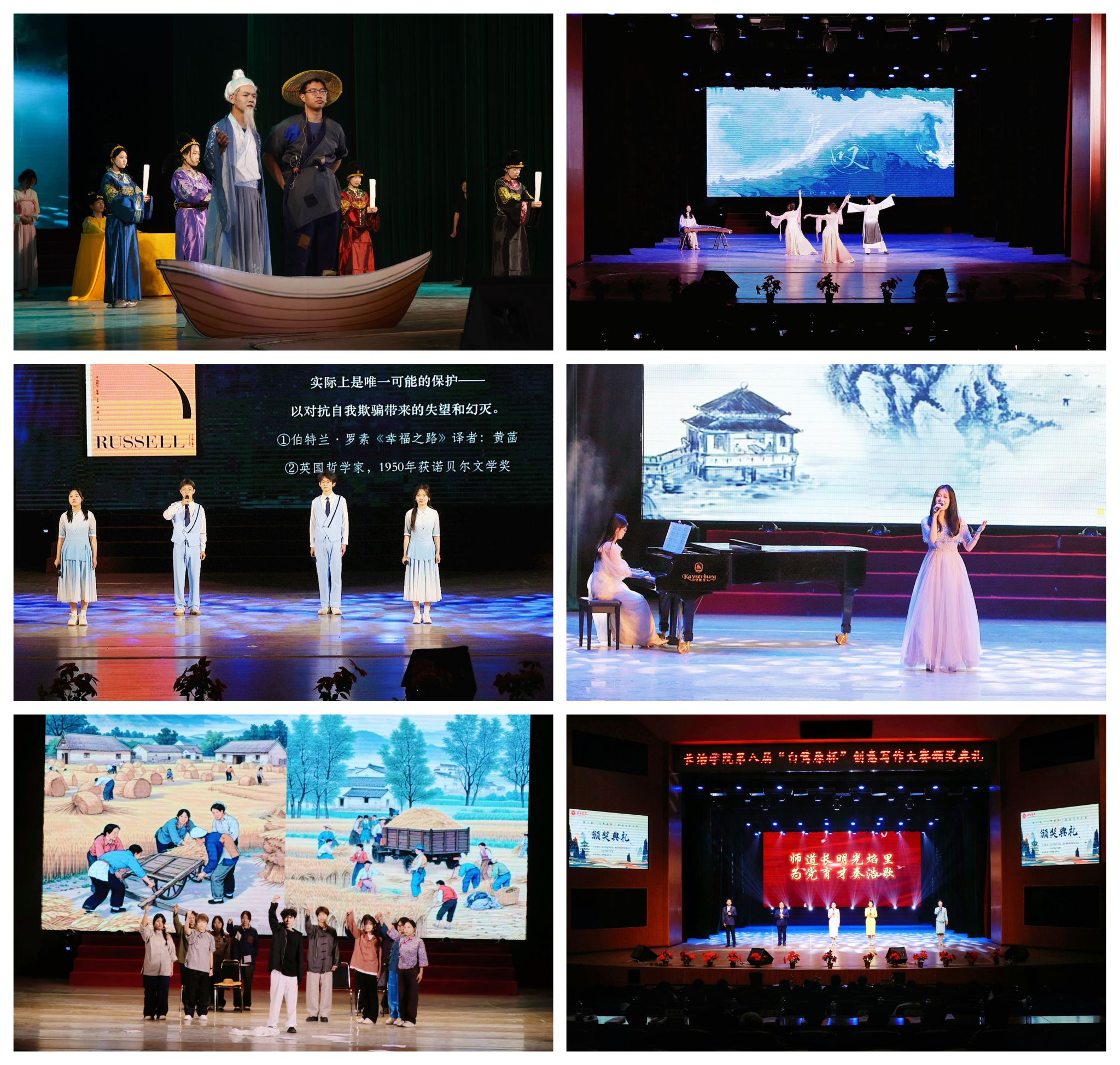 在颁奖典礼上,中文系师生创作的经典原创话剧《东坡》带领观众与东坡先生展开跨越时空的文学对话,感受他笔下的豪迈与豁达;舞蹈《怎叹》以灵动的舞步勾勒出细腻的情思,一颦一笑间尽显东方美学的韵味;朗诵《群星闪耀》用富有感染力的声音,带领大家穿梭于二十世纪的文学地标;歌曲《青花瓷》以悠扬的旋律和时尚的编曲,让经典在新时代焕发出勃勃生机;话剧《澎湃》重现了那段波澜壮阔的激昂岁月;中文系教师代表带来的诗歌朗诵《师德如灯照太行》传递出对教育事业的坚守与热爱,抑扬顿挫的朗诵声为观众带来了沉浸式的艺术享受。