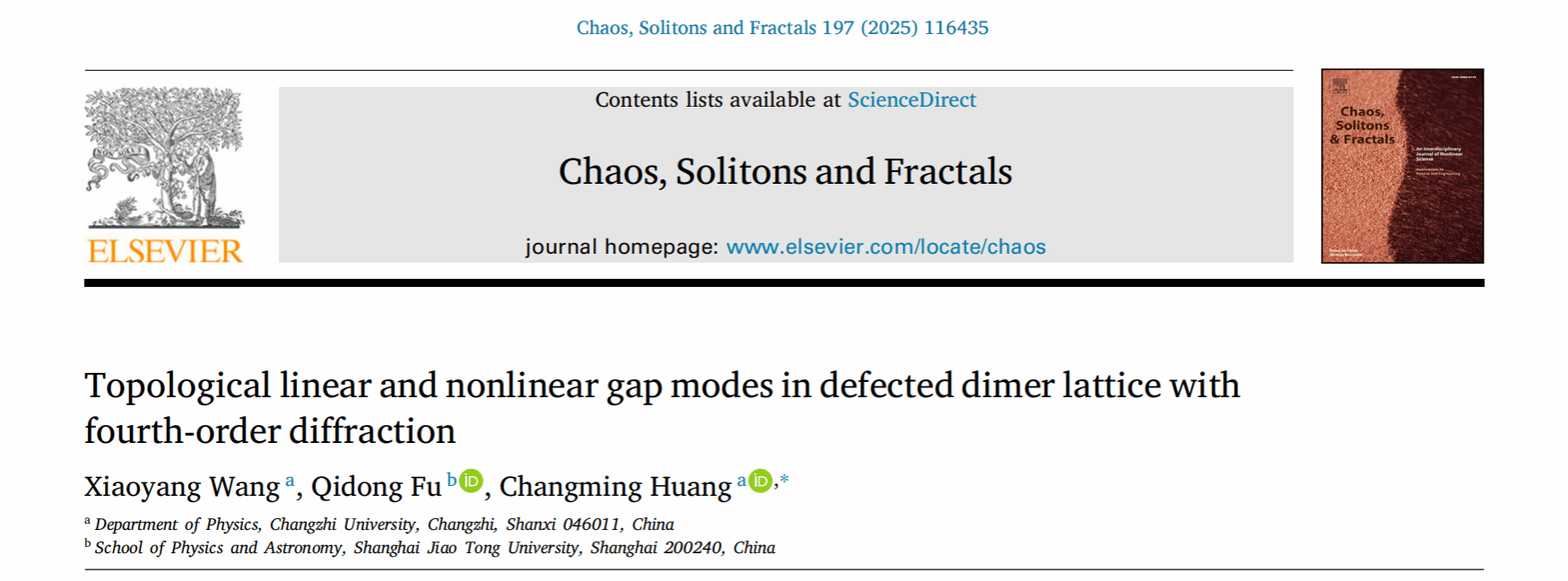 beat365物理系光电信息科学与工程专业2022级学生王晓阳以第一作者身份在《Chaos, Solitons and Fractals》(中科院SCI一区TOP)发表题为《Topological linear and nonlinear gap modes in defected dimer lattice with fourth-order diffraction》的研究论文,是beat365学生首次在该期刊发表研究成果,论文指导教师为beat365物理系教授黄长明。