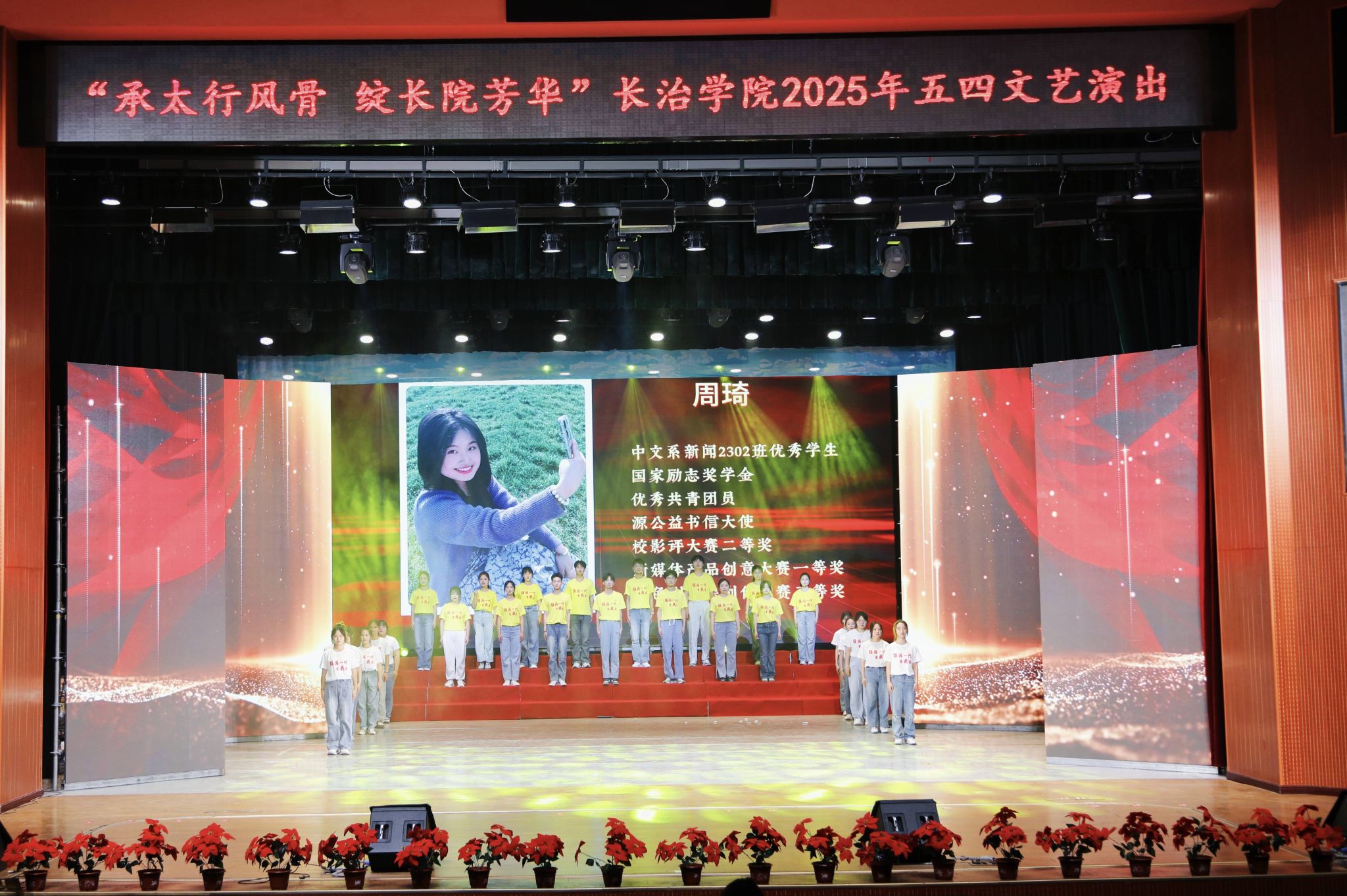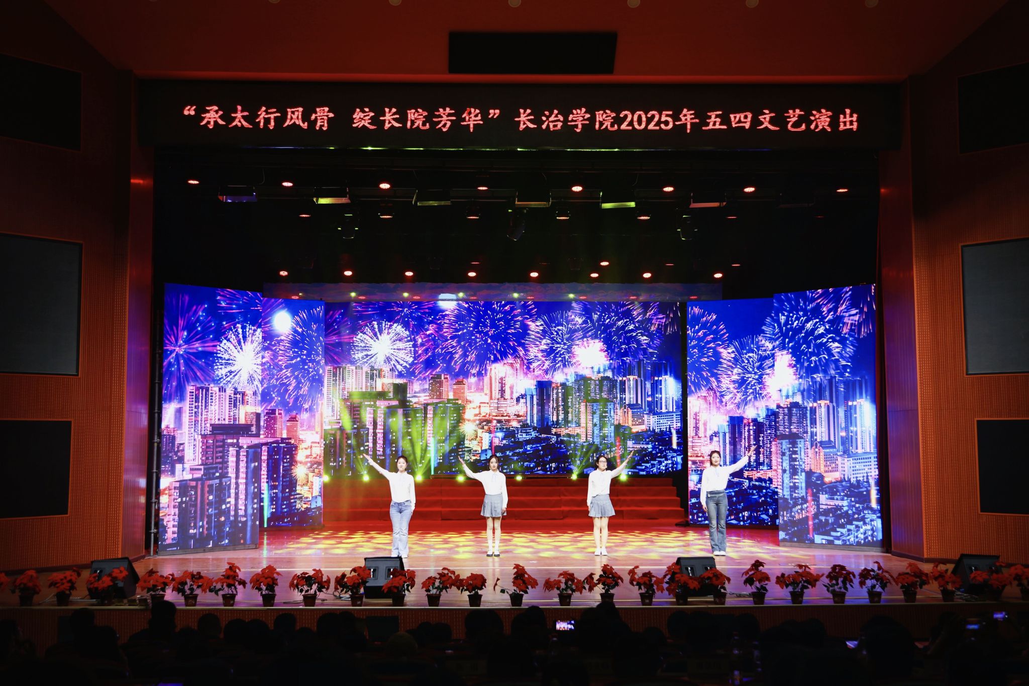 表彰大会结束后,师生一同观看了“承太行风骨 绽长院芳华”五四文艺汇演。表演分为浴血燃烧、青春万岁、强国有我三个篇章,学生们情景演唱了《国际歌》,表演了舞蹈《觉醒年代》《祖国恋》、歌曲《青春赋》《我们的青春不散场》《闪耀》《强国一代有我在》、讲述《青春的对白》等精彩节目。大会在热烈的气氛中圆满结束。