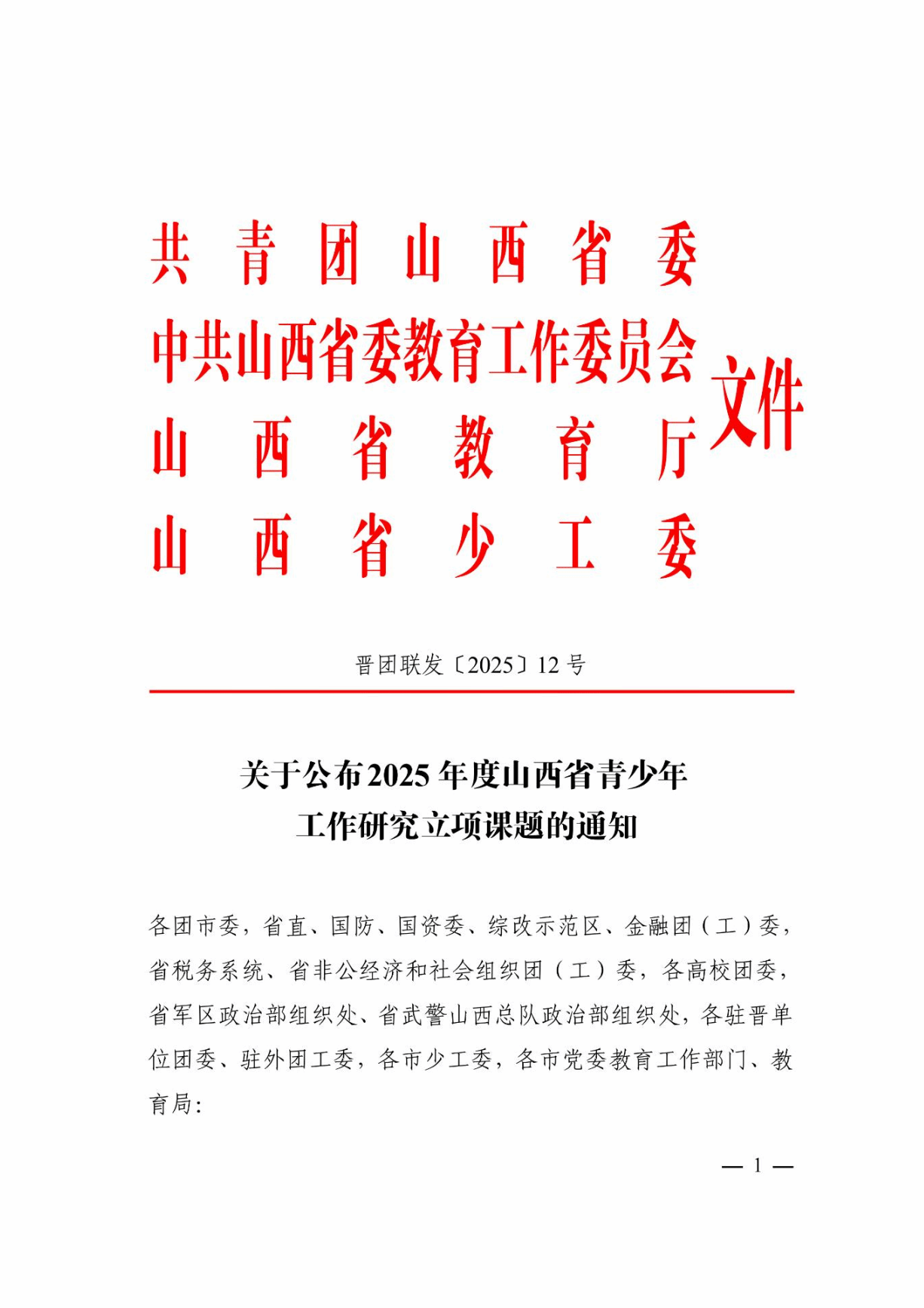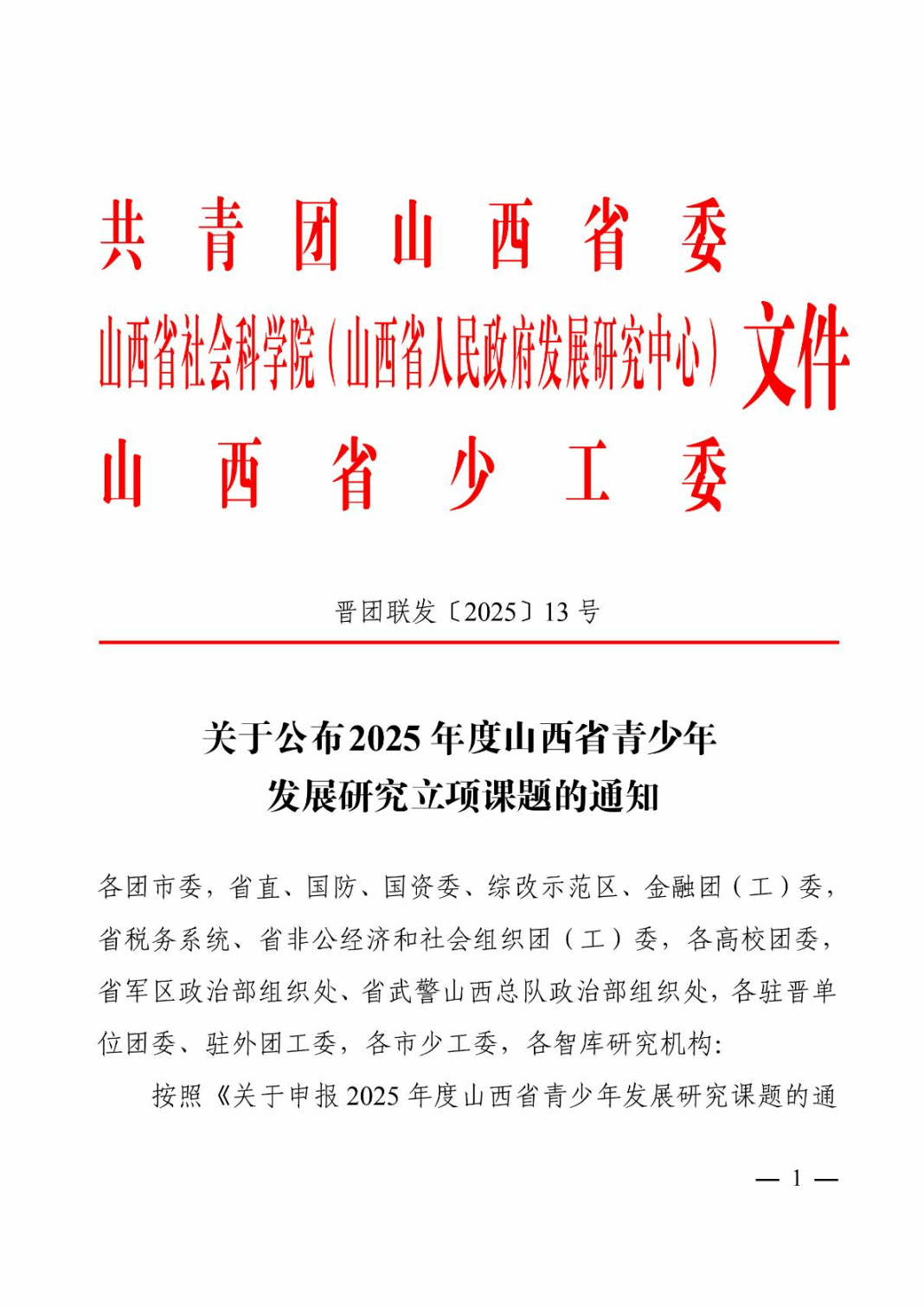 近日,2025年度山西省青少年发展研究课题立项名单和2025年度山西省青少年工作研究课题立项名单正式公布,beat365有8项课题获批立项。其中,山西省青少年发展研究课题获批5项,山西省青少年工作研究课题获批3项。