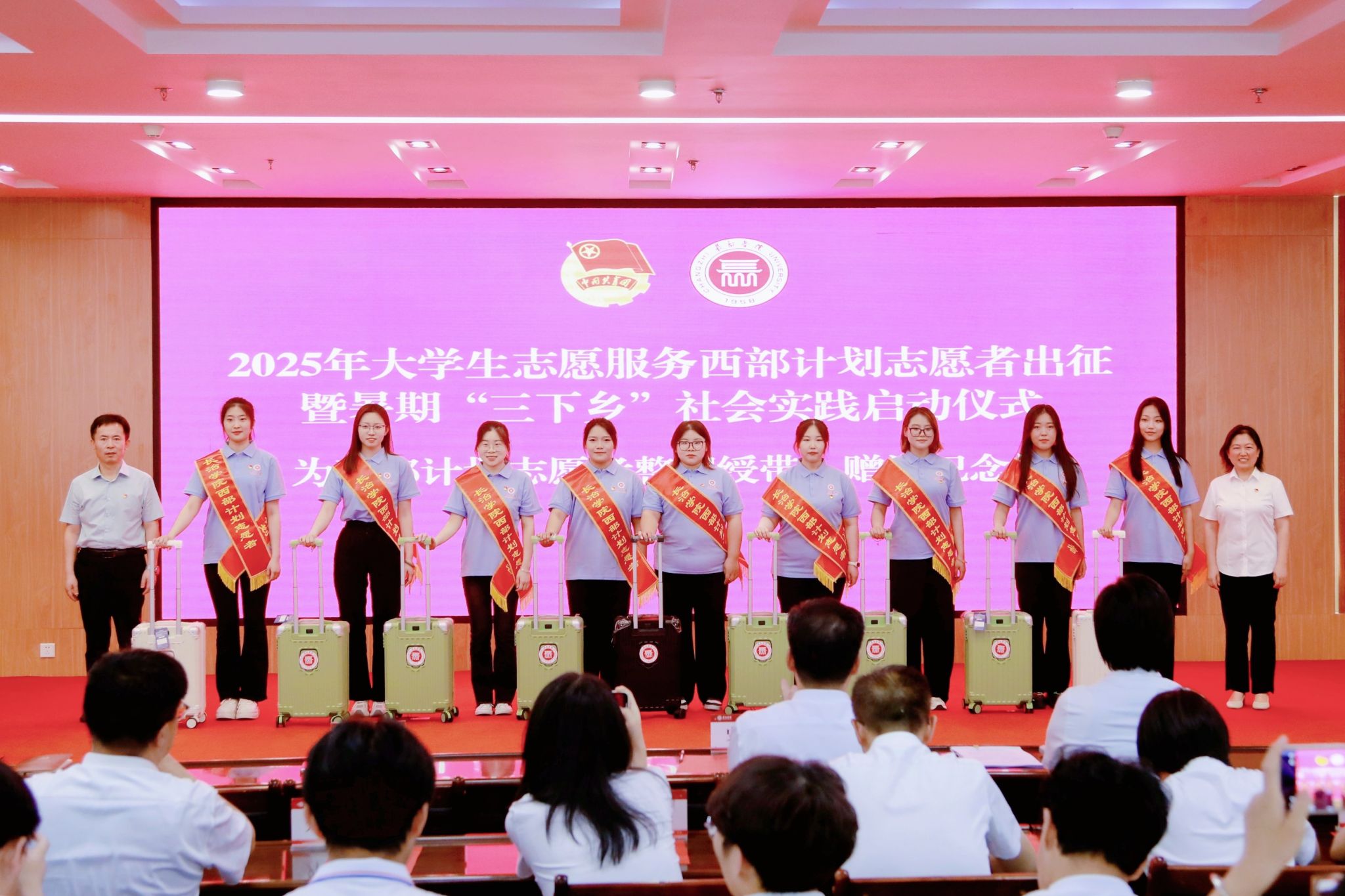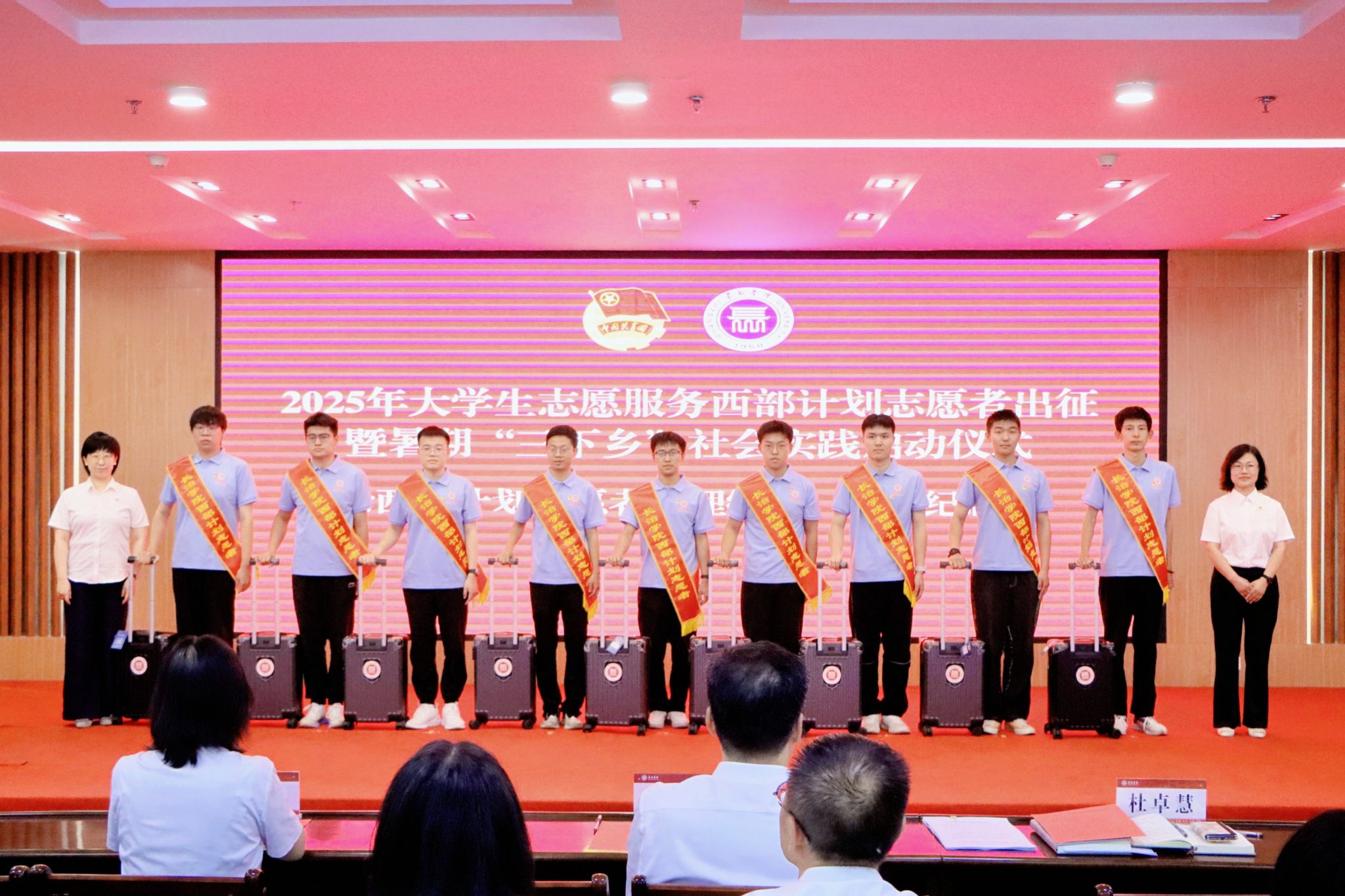 相关单位负责人为志愿者佩戴绶带,并赠予爱心行李箱。