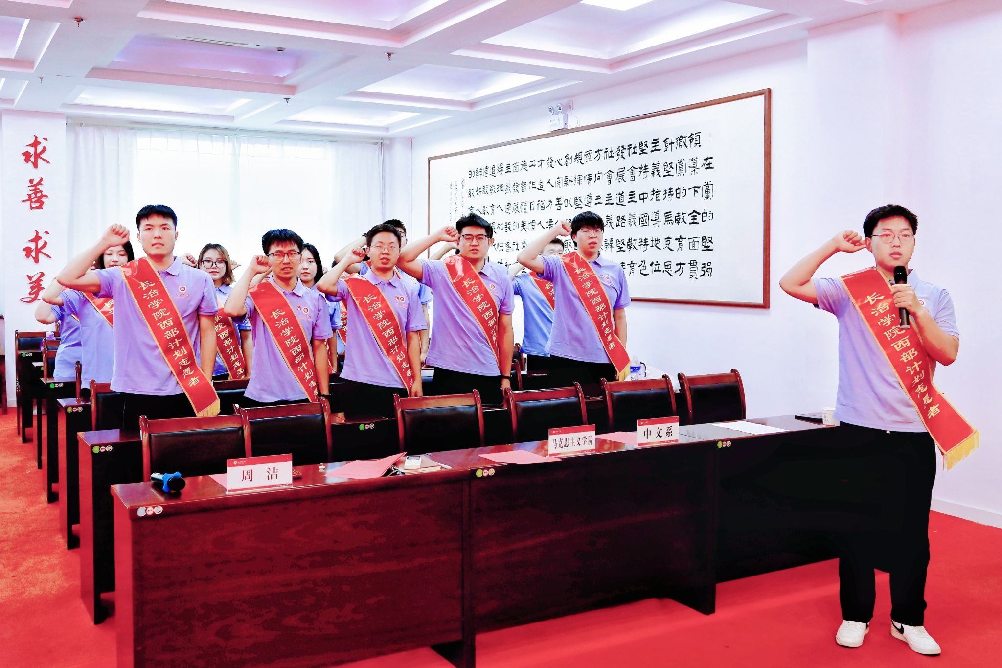 西部计划志愿者在计算机系计科2101班学生肖冬冬的领誓下进行了庄严宣誓。