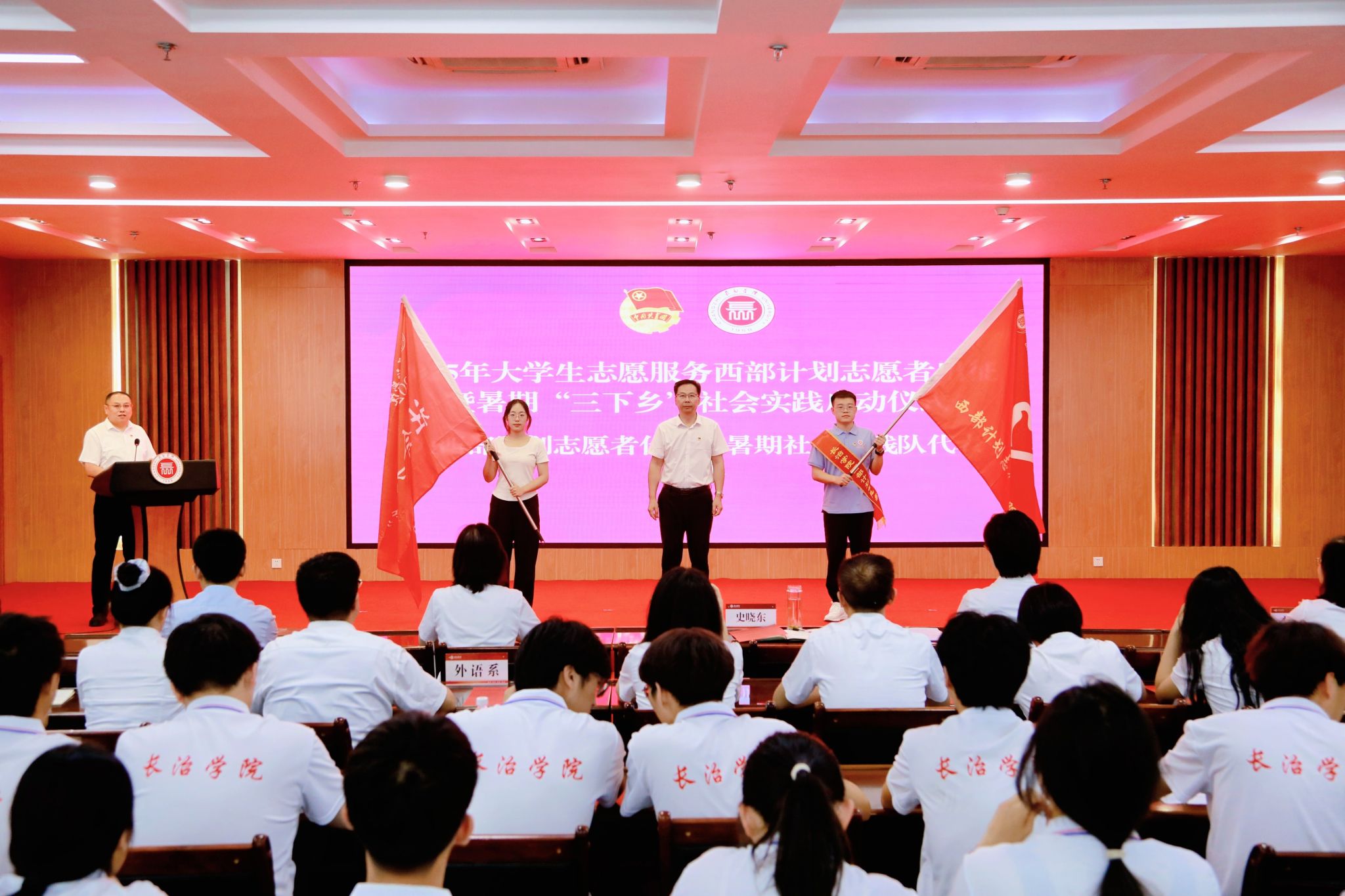 史晓东为西部计划志愿者代表和社会实践校级重点团队代表授旗。他围绕习近平总书记给谢依特小学戍边支教西部计划志愿者服务队队员重要回信精神,对西部志愿者和社会实践团队提出四点希望:一是要坚定理想信念,以“功成不必在我”的情怀扎根基层,以“功成必定有我”的决心砥砺前行,在基层实践中铸就忠诚;二是要厚植家国情怀,将对祖国和人民的热爱化作实际行动,助力乡村发展,促进社会和谐;三是要练就过硬本领,把知识与实践相结合,在解决问题中积累经验、增长才干;四是要发扬奋斗精神,以“咬定青山不放松”的韧劲和“不破楼兰终不还”的拼劲,在强国建设中激扬青春活力。
