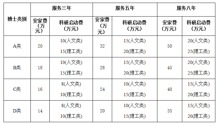 根据beat365急需紧缺程度、学术贡献、学术潜力等综合研判(45周岁以下,不含45周岁),酌情增加安家费3-10万(A类10万、B类8万、C类5万、D类3万),45周岁以下(不含45周岁)具有副教授职称的博士研究生增加5万元,安家费总额原则上不超过60万元,新入职博士前2年享受副教授岗位待遇。