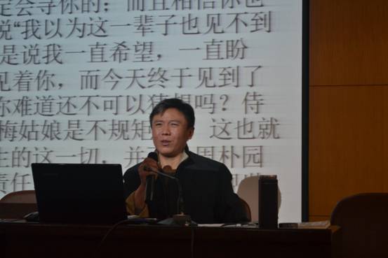 杨根红老师将自己多年来对《雷雨》的理解进行了深刻诠释。首先,他对作者曹禺的生平进行了详细介绍,并就《雷雨》这一悲剧故事做了总体概括。随后,就“周朴园与侍萍之间的感情”、“周萍与四凤的爱情”这两个专题进行了深入分析。最后,对剧本的社会意义与哲学意义发表了评论。杨老师讲解幽默风趣、生动细致,赢得了在场学生的阵阵掌声。
