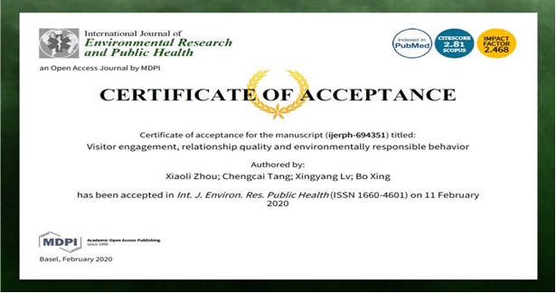 近日,历史文化与旅游管理系教师周晓丽以第一作者身份,联合北京第二外国语学院唐承财教授和西南财经大学吕兴洋副教授在SSCI期刊《International Journal of Environmental Research and Public Health》(影响因子:2.468)上发表学术论文“Visitor engagement, relationship quality and environmentally responsible behavior”(游客契合、关系质量与游客环境责任行为),该文从关系营销学的视角出发,借助游客与目的地之间的“契合”这一重要构念,聚焦于游客自觉、主动型环境责任行为的激发,为目的地实现可持续发展提供理论指导和实践启示。 该论文是历史文化与旅游管理系的第一篇SSCI收录论文,也是我院首篇被SSCI收录的学术论文,它的发表有力地促推了我院旅游学科建设与科研水平提升,为旅游管理专业硕士点的建设注入了新动力。