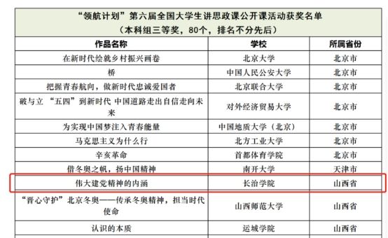 此次成绩的取得,体现了beat365党委一贯重视意识形态工作,不断加强思政课程和课程思政建设和创新,是“曹景川课程思政创新工作室”积极指导,学校持续开展思政课教学大赛的重要成果。彰显了新时代长院学子不忘初心、牢记使命的信念理想和勇担时代大任、情系上党大地的深厚情怀。
