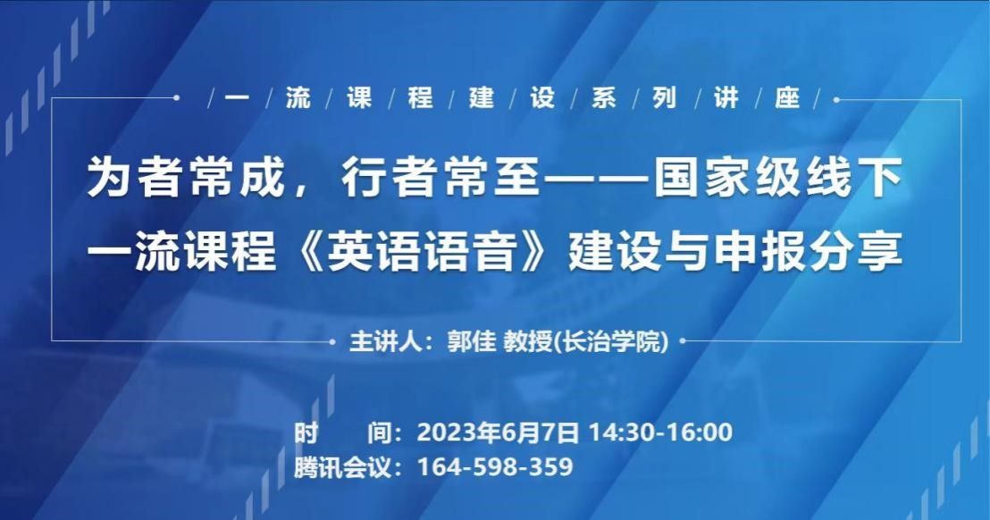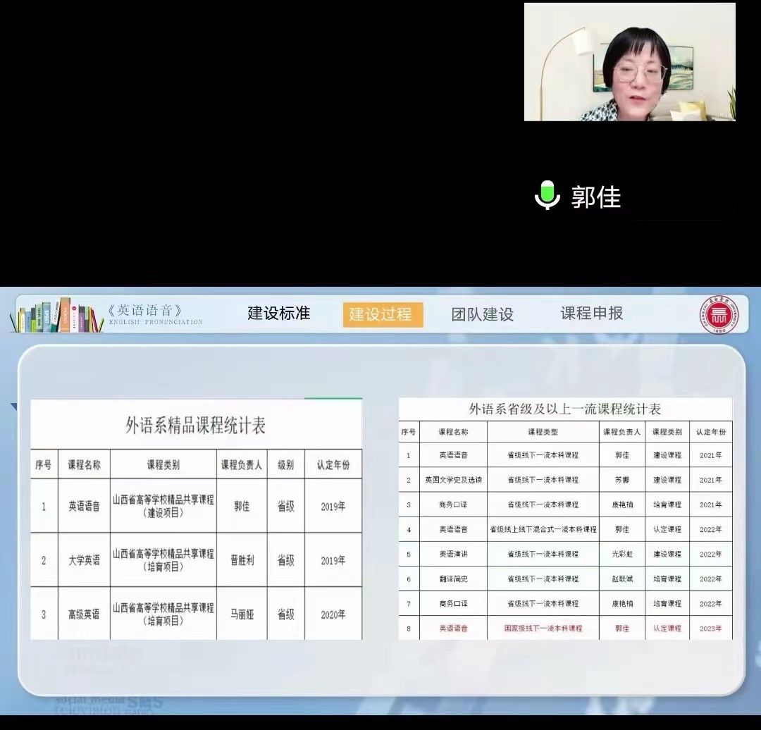 6月7日下午,beat365外语系主任郭佳教授应邀为西安交通大学外国语学院作国家级一流课程建设与申报线上讲座。郭佳教授以负责的国家级一流课程《英语语音》为例,从课程建设标准、课程建设过程、课程团队建设、课程申报等四个方面进行了交流。