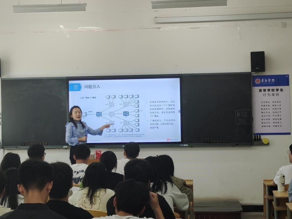此次“公开观摩课”由计算机系侯慧玲副教授主讲,课程名称为《路由与交换技术》。课上,侯老师结合网络中VLAN通信遇到的实际问题,和学生共同探索了VLAN间通信三种方法的优缺点及配置方案。整个课堂教学信息量大,教学结构科学合理,教师教学从容有度。在教学过程中,师生互动活跃,课堂氛围好,侯老师在教授知识的同时,向学生渗透了工程师思维和科学价值观。