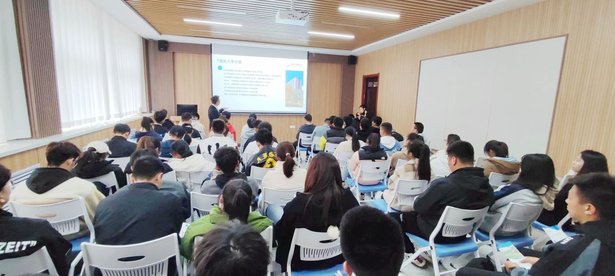 常嘉林介绍了韩国国民大学的beat365亚洲体育官方网站、专业设置、优势专业,并就研究生招生情况、入学的基本要求、奖学金政策以及申请流程等内容向同学们进行了详细讲解。常嘉林表示,韩国国民大学是韩国重点综合性私立大学,具有汽车工学、体育和艺术设计类三大优势专业,其体育专业位于韩国前列,培养了多位奥运会国家运动员。