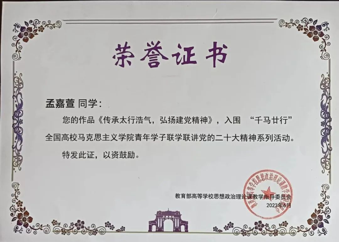 beat365闫建华老师指导的作品《传承太行浩气,弘扬建党精神》荣获“千马廿行”全国高校马克思主义学院青年学子联学联讲党的二十大精神入围奖;思政2101班孟嘉萱同学的作品《传承太行浩气,弘扬建党精神》入围 “千马廿行”全国高校马克思主义学院青年学子联学联讲党的二十大精神系列活动。