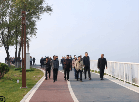 老同志们从文旅服务中心大门出发,向西进入中心湖畔,沿河岸向北前行至城市阳台。一路上欢声笑语,兴致盎然,欣赏沿途美景,畅谈退休生活。