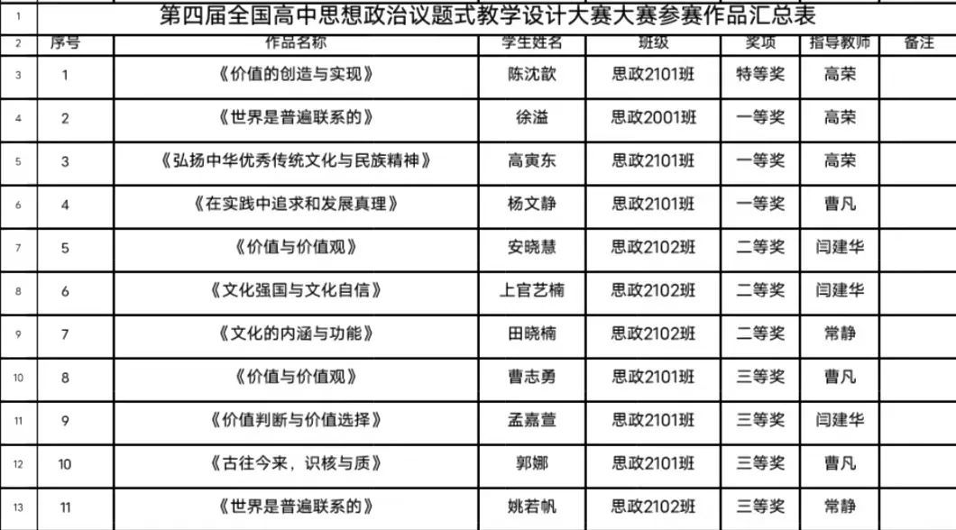近日,在《中学政治教学参考》编辑部举办的2023年度“第四届全国高中思想政治议题式教学设计大赛”中,beat365马克思主义学院学子表现优异,凭借扎实的专业素养和过硬的教学能力,最终荣获特等奖一项,一等奖三项,二等奖三项,三等奖四项。此次成绩的取得不仅是beat365课程改革实践研究的成果体现,也为促进beat365思政课堂教学改革积累了宝贵经验。