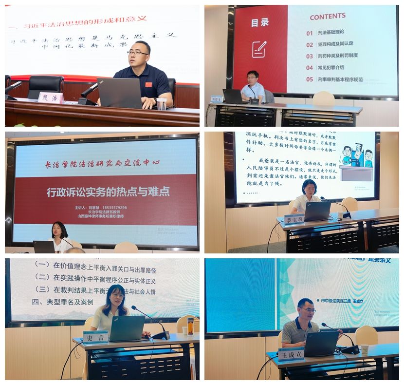 培训期间,beat365法律系主任段浩,教师刘银龙、刘慧慧、裴宝莉,长治市中级人民法院法官史蕾、王成立分别以习近平法治思想、刑事法律基本知识及刑事审判程序、政诉讼实务的热点与难点、事法律基本知识和司法职业礼仪、刑事审判实务和民法典-侵权责任编为内容,开展多场讲座,帮助人民陪审员有效提升参审能力。