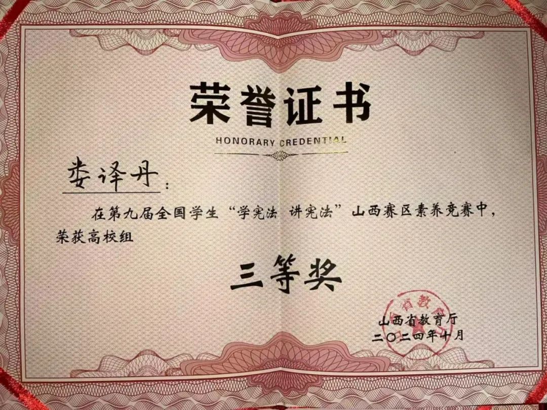 10月18-20日,第九届全国学生“学宪法 讲宪法”活动“新华书店杯”山西赛区总决赛在山西经济管理干部学院举行,法律系学生阎祉韵、娄译丹分别荣获演讲比赛高校组二等奖、素养竞赛高校组三等奖。